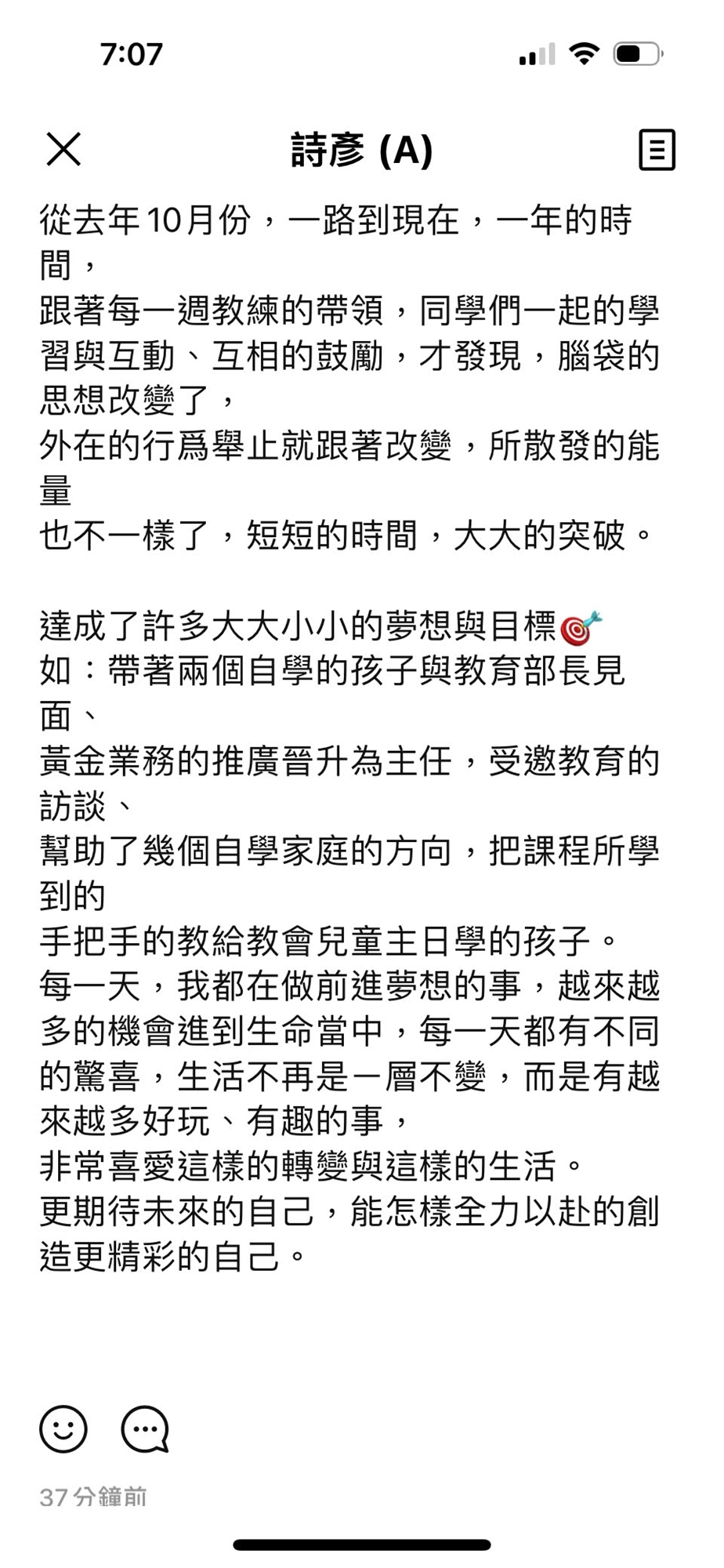 詩彥:「有教練的帶領、同學的互動鼓勵,我腦袋的思想改變了,外在行為舉止也跟著改變,現在我每一天都在做前進夢想的事情,也有越來越多機會進入生命當中,每天都有不同的驚喜,有越來越多好玩、有趣的事。」