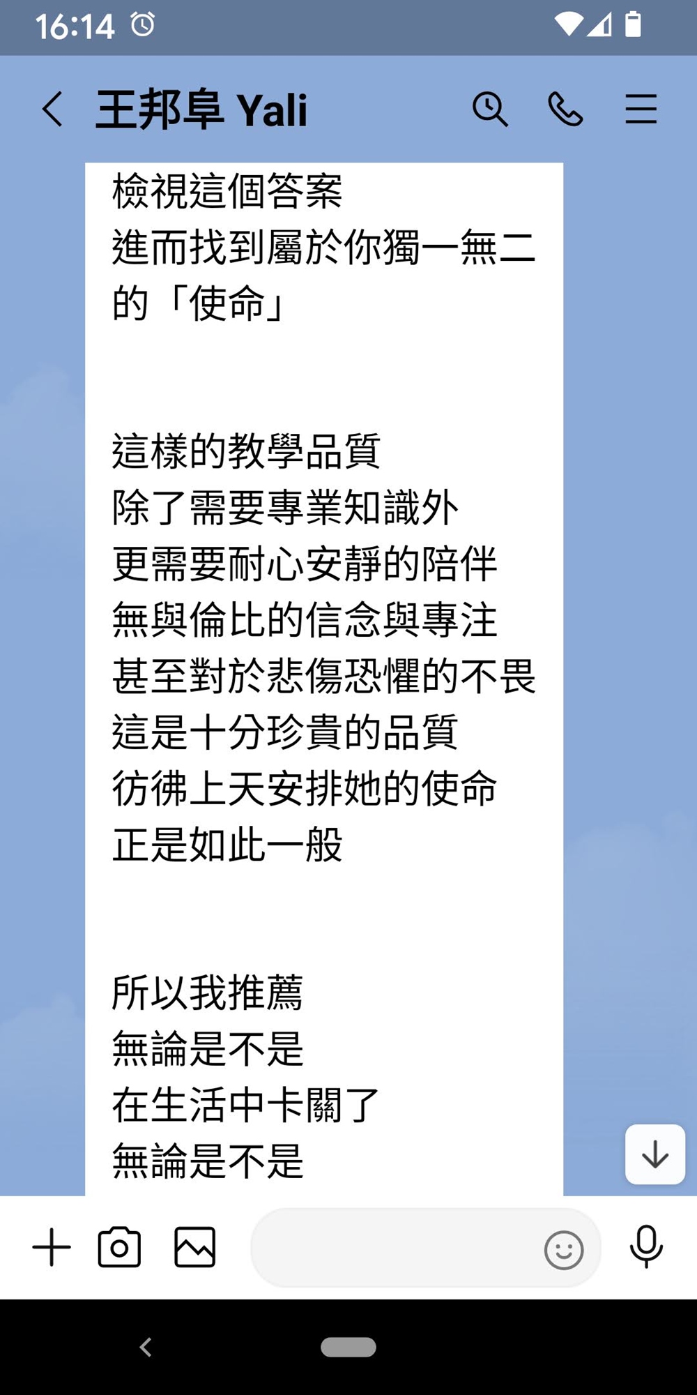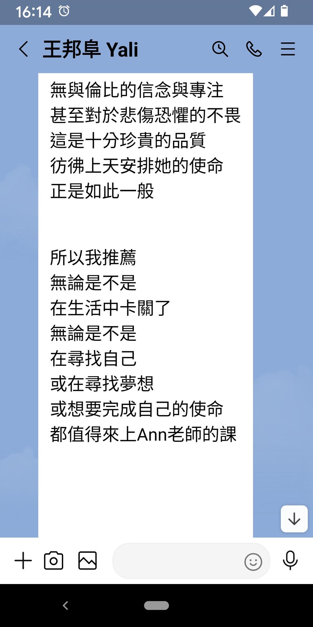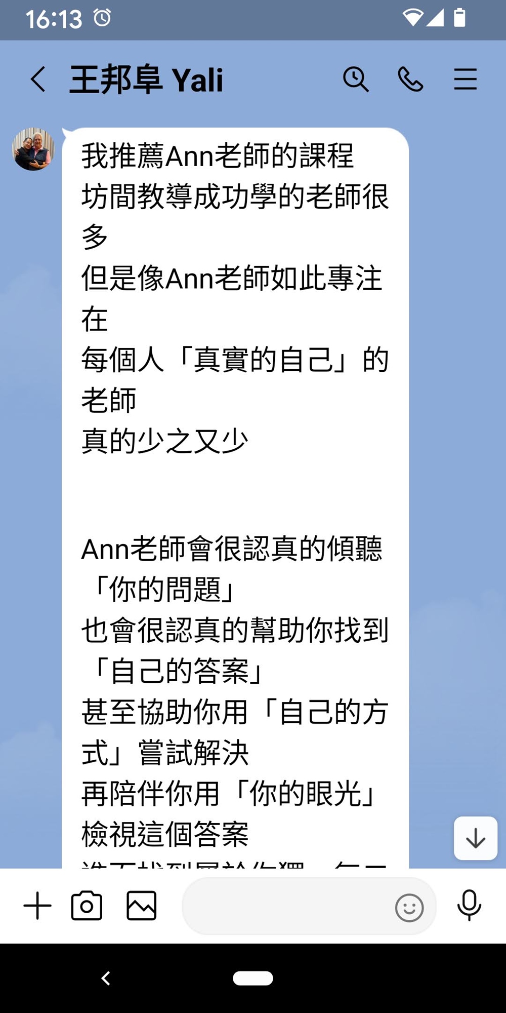王邦阜Yali:「Ann很專注在每個人真實的自己,會很認真傾聽你的問題、找到自己的答案,用自己的方式嘗試解決、再陪伴你用你的眼光檢視答案,進而找到屬於你獨一無二的使命。」