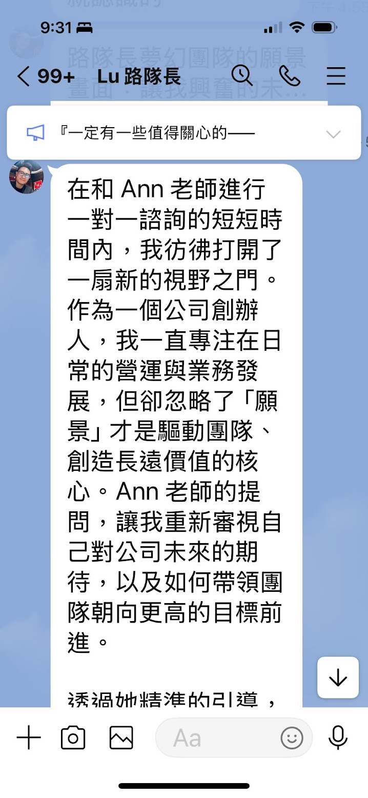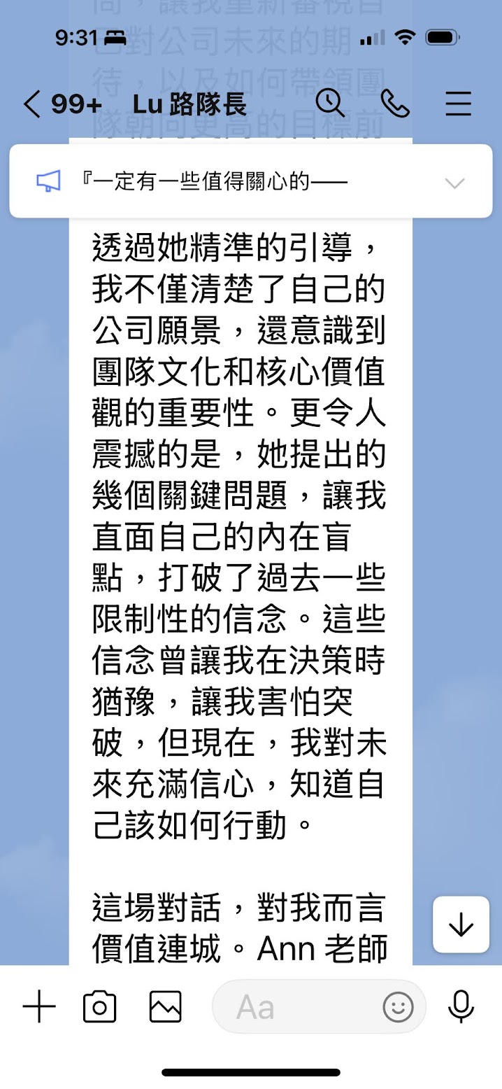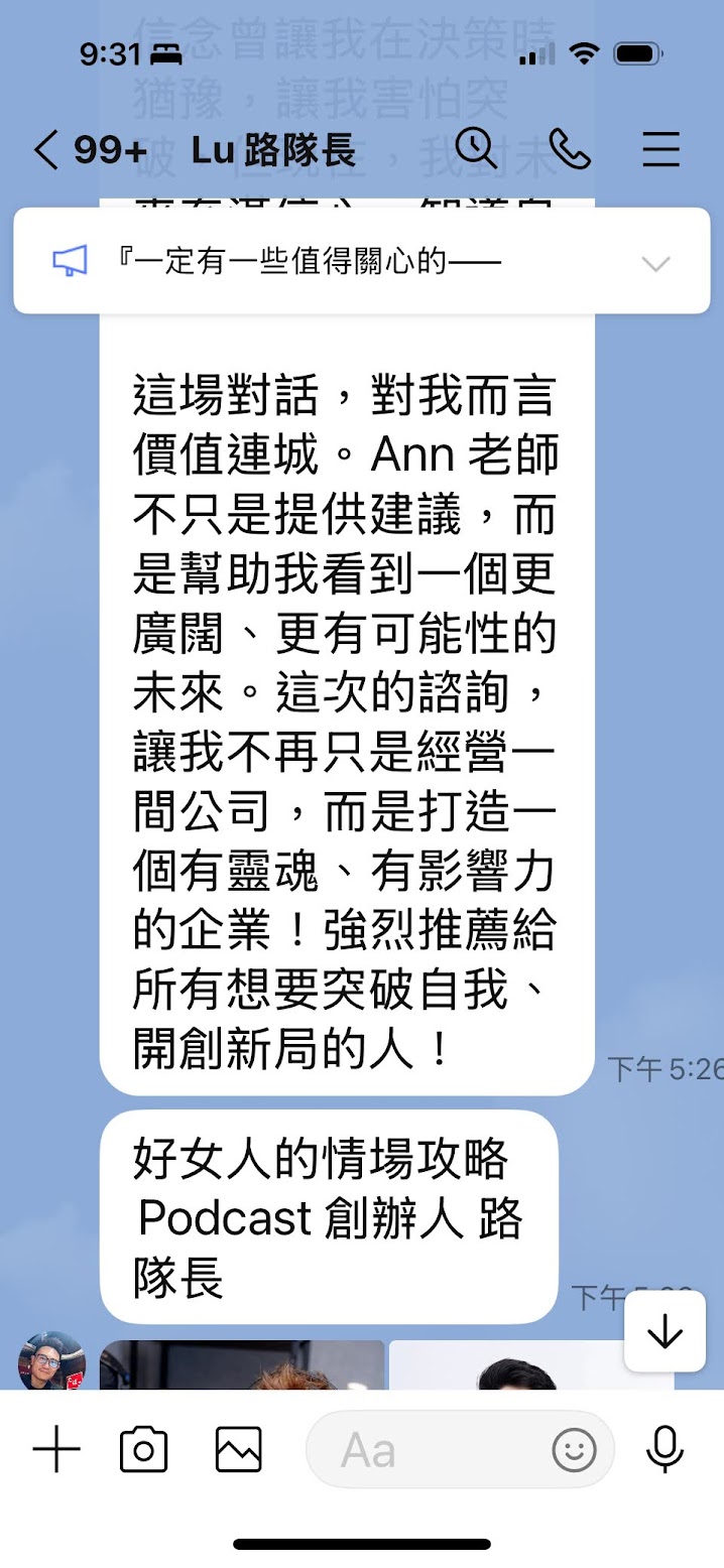 好女人情場攻略創辦人 路隊長 :「與Ann老師的談話,對我而言價值連城。她的提問讓我直面內在盲點、打破了過去的限制性信念,並且看到一個更廣闊、更有可能性的未來。強烈推薦給所有想要突破自我、開創新局的人!」