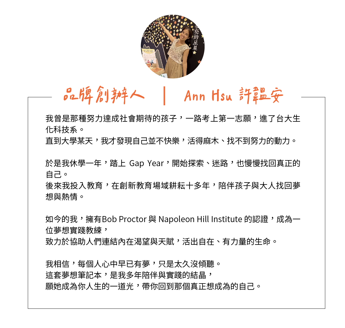 Ann 是一位陪伴無數大人與孩子重新找回方向的夢想教練。