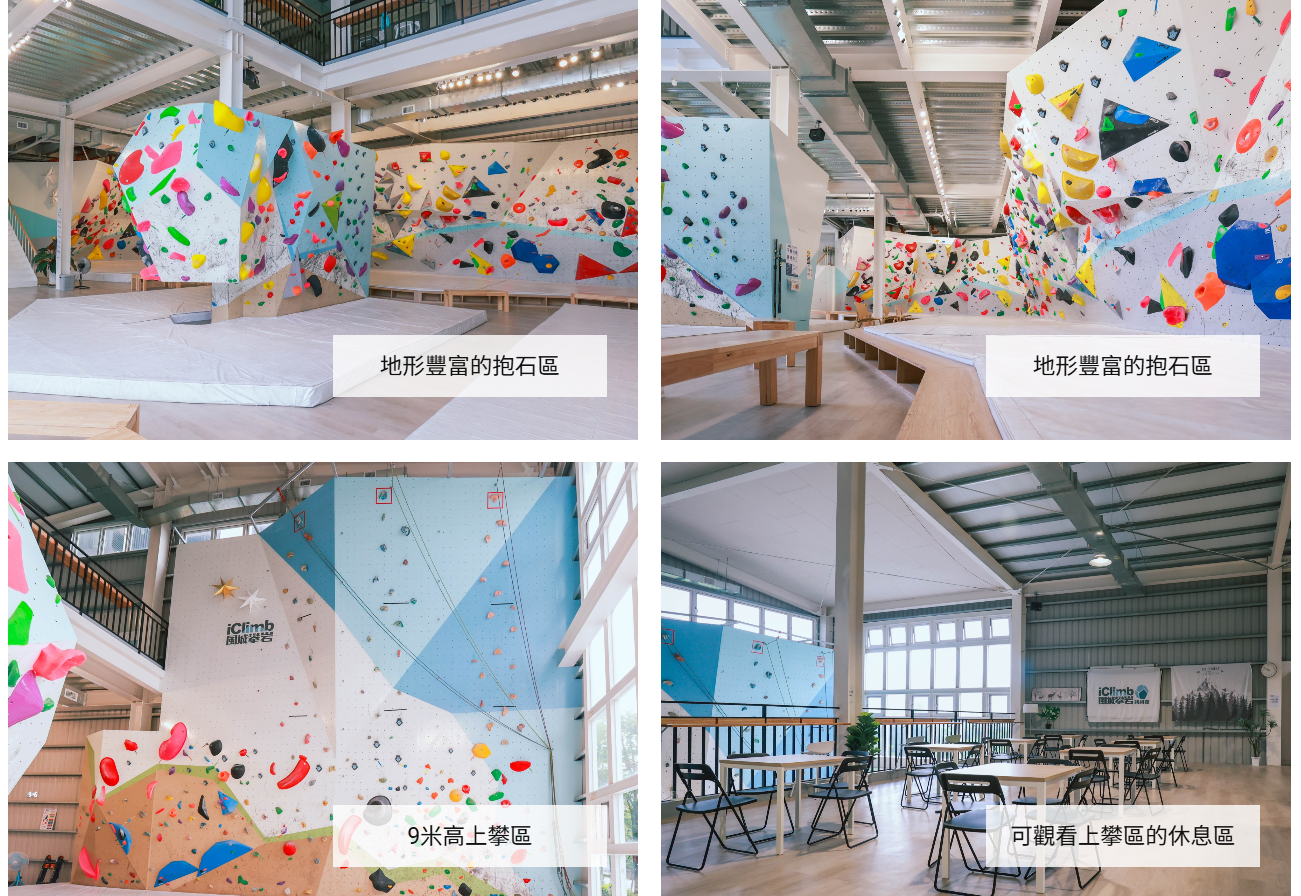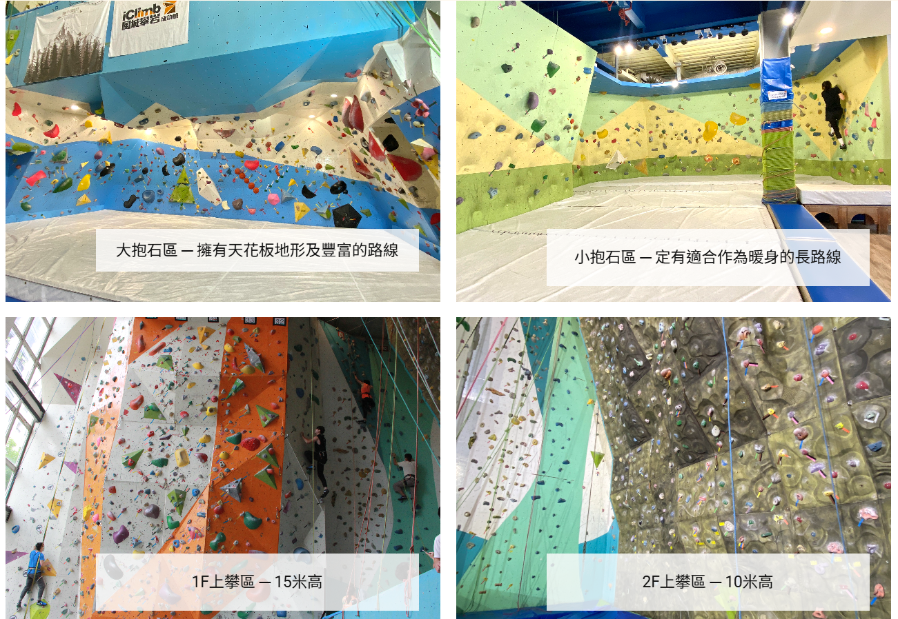 - 場地裝備符合國際安全規格,同時享受上攀登頂與抱石樂趣的完整攀岩體驗