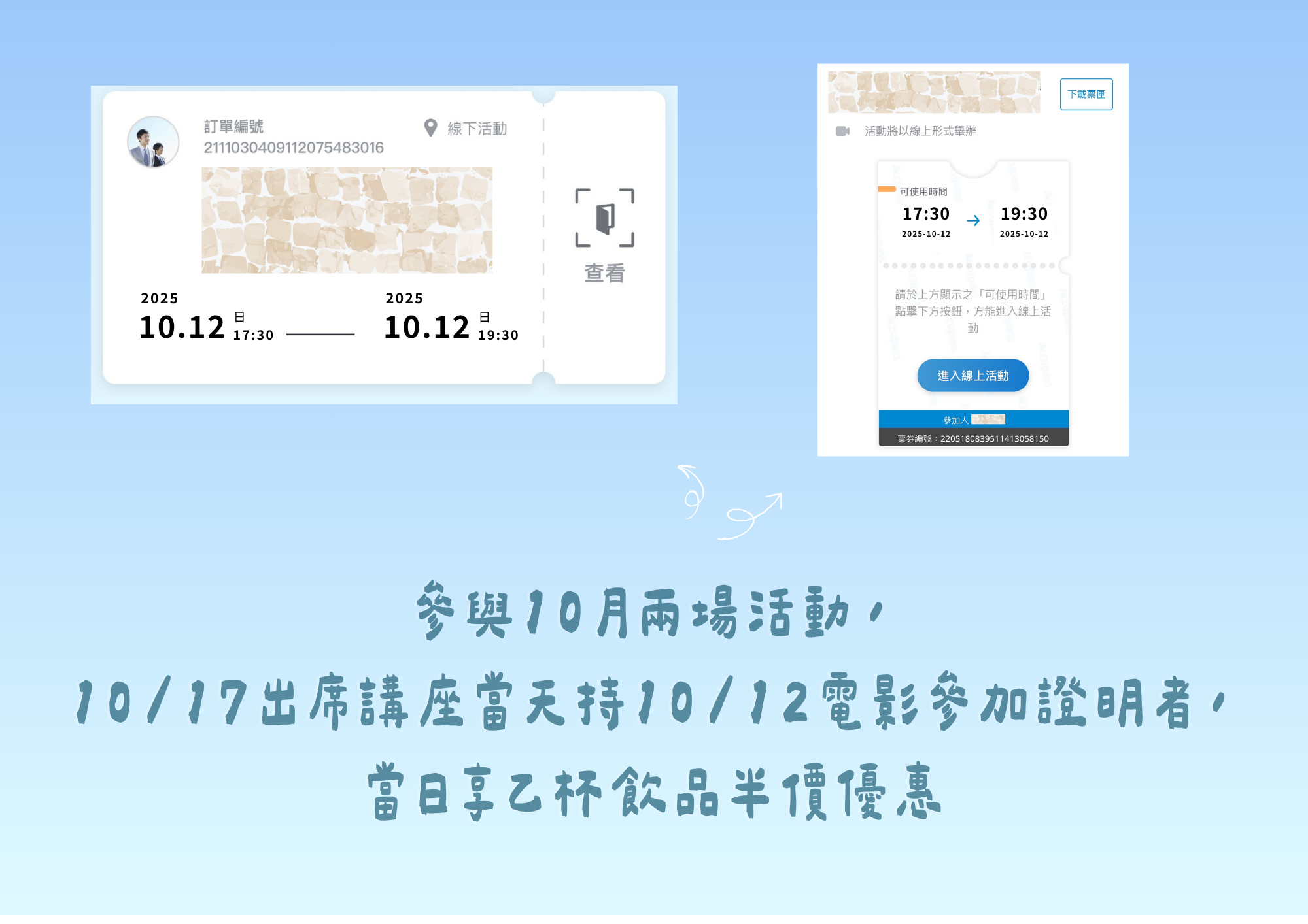 △ 兩場活動都參加享優惠!持10/12 電影放映會參加證明報名10/17(五)講座,講座當天出示證明享乙杯飲品半價優惠
