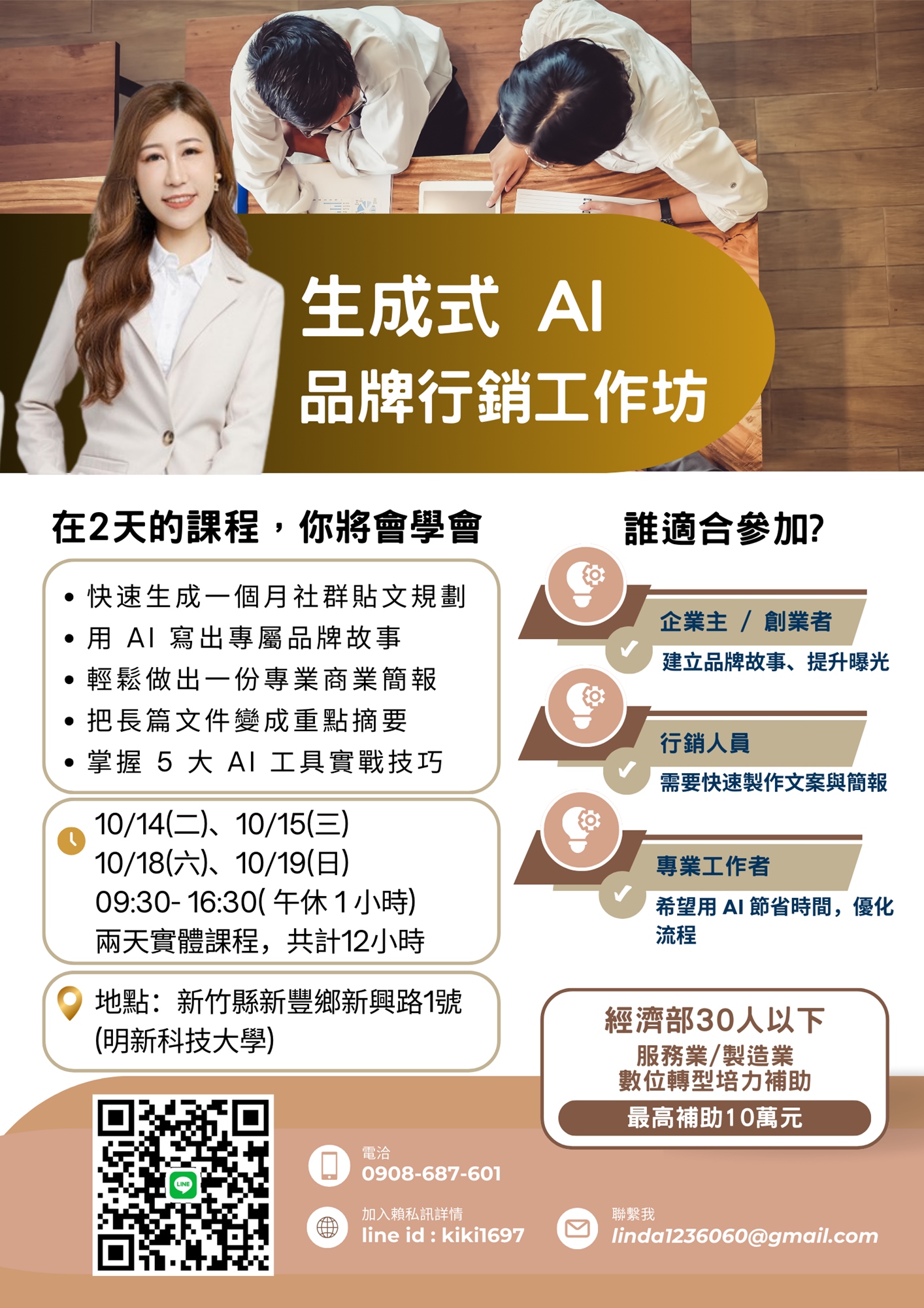 本課程由經濟部補助,全程免費參與,專為中小企業與創業者打造,協助掌握 AI 工具、提升品牌行銷與簡報實戰力。因名額有限,額滿即止!