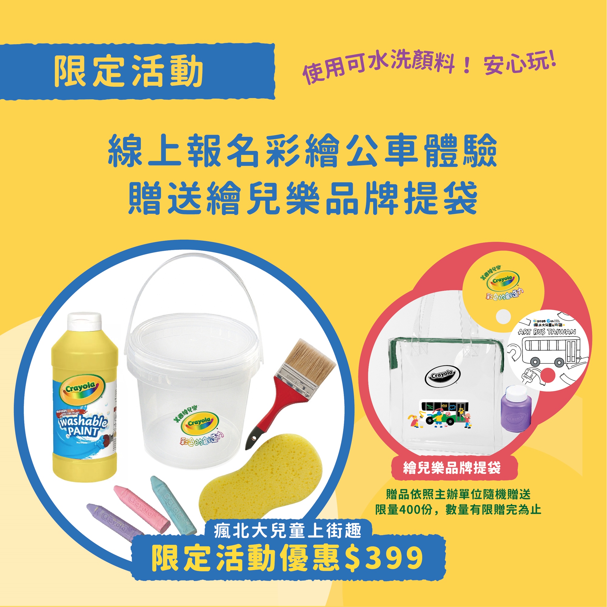 體驗券包含:美國crayola 繪兒樂 可水洗兒童顏料16OZ(不挑色) 1瓶、MIT小提桶 1個、MIT刷子1把、美國crayola 繪兒樂可水洗地板粉筆 3隻、洗車海綿1塊。 線上預購贈送: 繪兒樂品牌提袋+彩繪公車彩繪扇+可水洗兒童顏料2OZ(不挑色) 1瓶一組(價值$250) (贈品數量有限,送完為止, 主辦單位保有調整贈品內容之權利)。