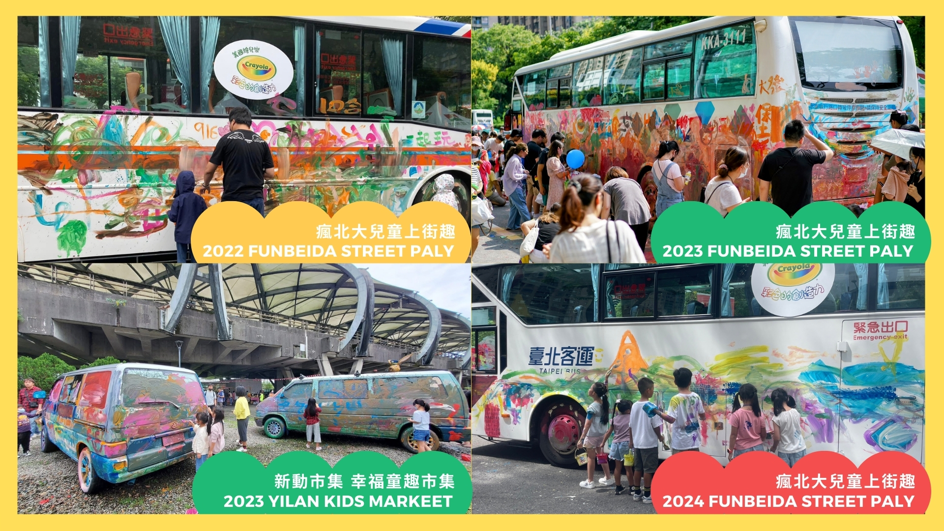 自2022年由瘋北大發起的彩繪公車遊戲在台灣引起廣泛關注。該活動結合台北客運與美國繪兒樂的支持,成功推出亞洲首創的彩繪公車遊戲(Art Bus Taiwan)。參與者使用可水洗兒童顏料在公車上盡情揮灑創意,讓大人小孩都能自由遊戲,享受創作的樂趣。這項活動不僅增添了生活的趣味,還促進了親子互動和社區參與,成為瘋北大兒童上街趣獨具特色活動,深受大家的喜愛。