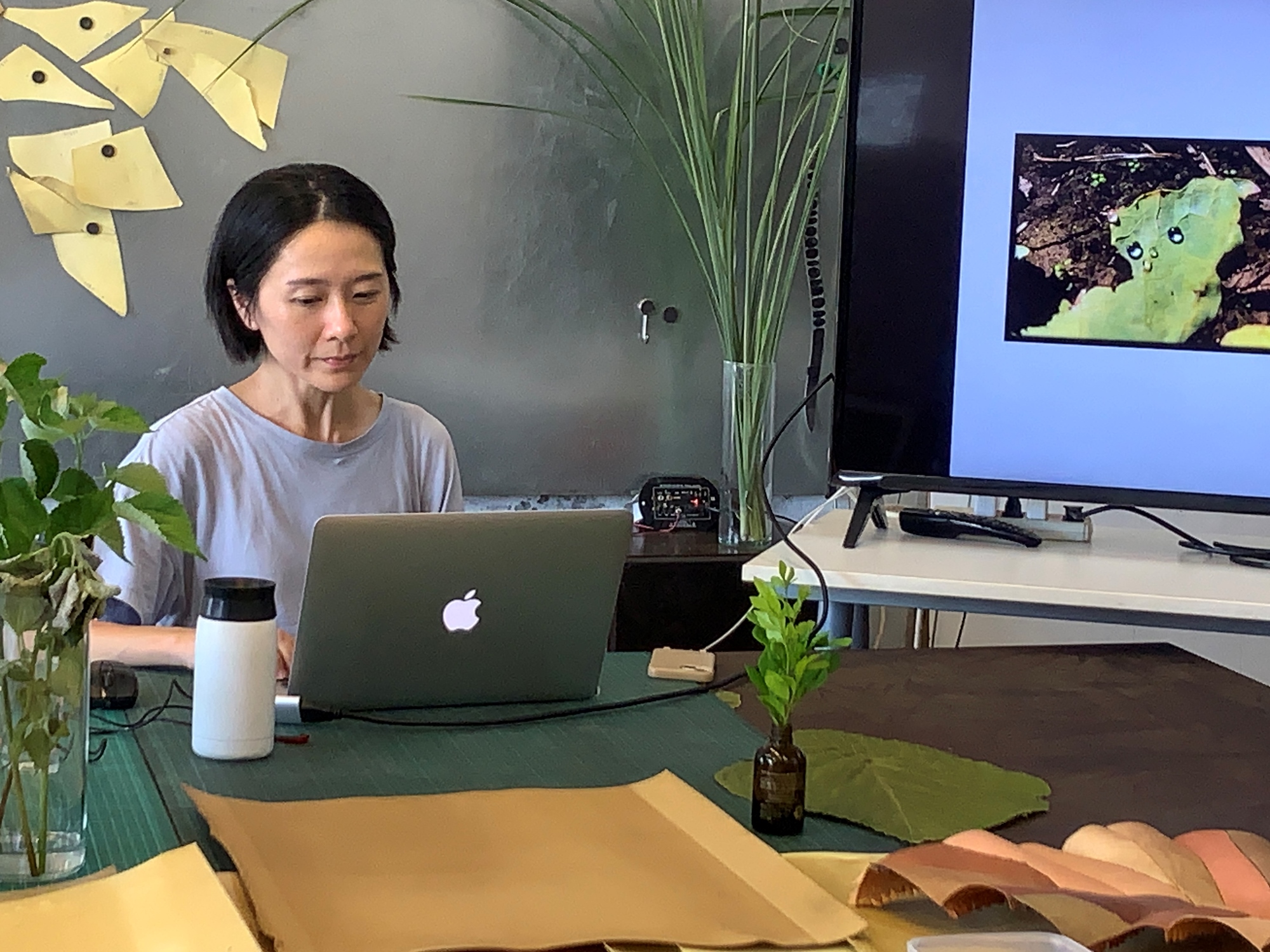 使用現地植物煮染,將葉片與枝幹的色澤浸入紙材。