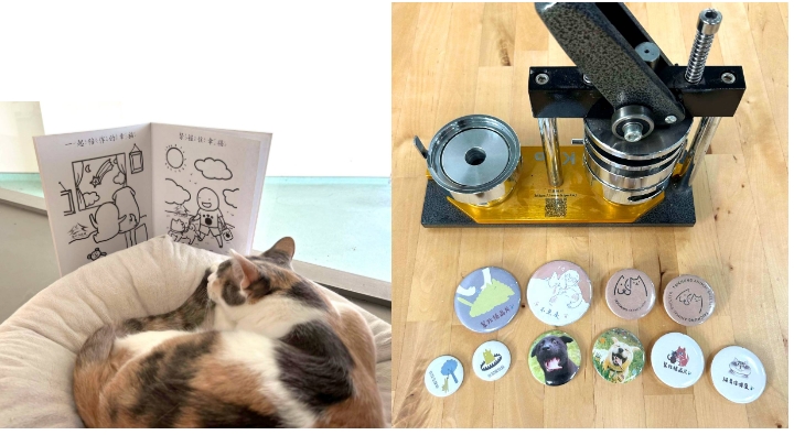 體驗區提供動物繪本,讓大朋友小朋友共同彩繪,還有自製胸章,手繪完胸章圖樣後,再親手壓製成胸章,在野餐日的這天還能帶紀念品回家。