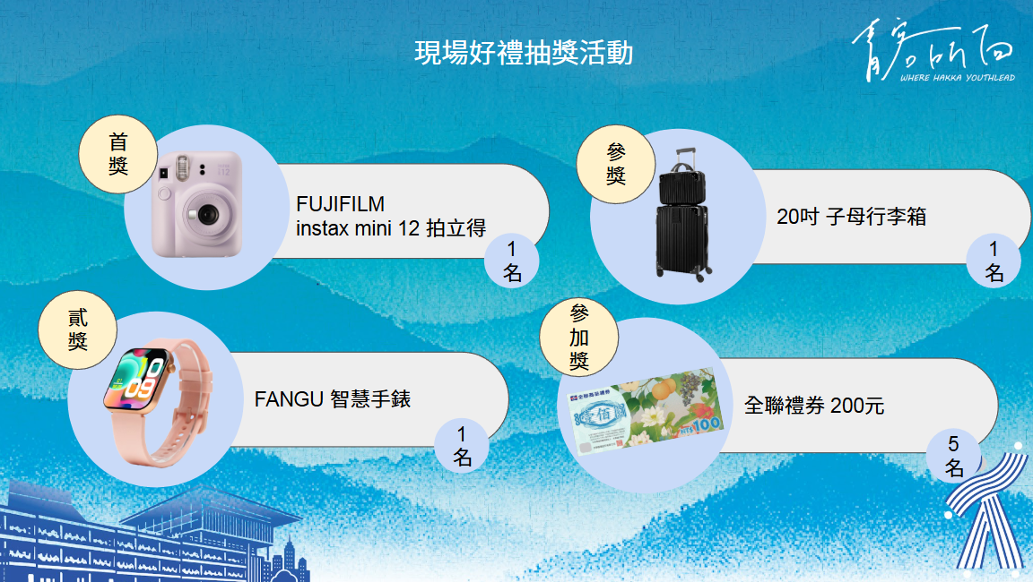 - 參加即表示同意活動內容所錄製或拍攝之照片、影片、聲音、肖像版權提供台北市客家文化基金會,以任何形式公開播映作為推廣宣傳使用。