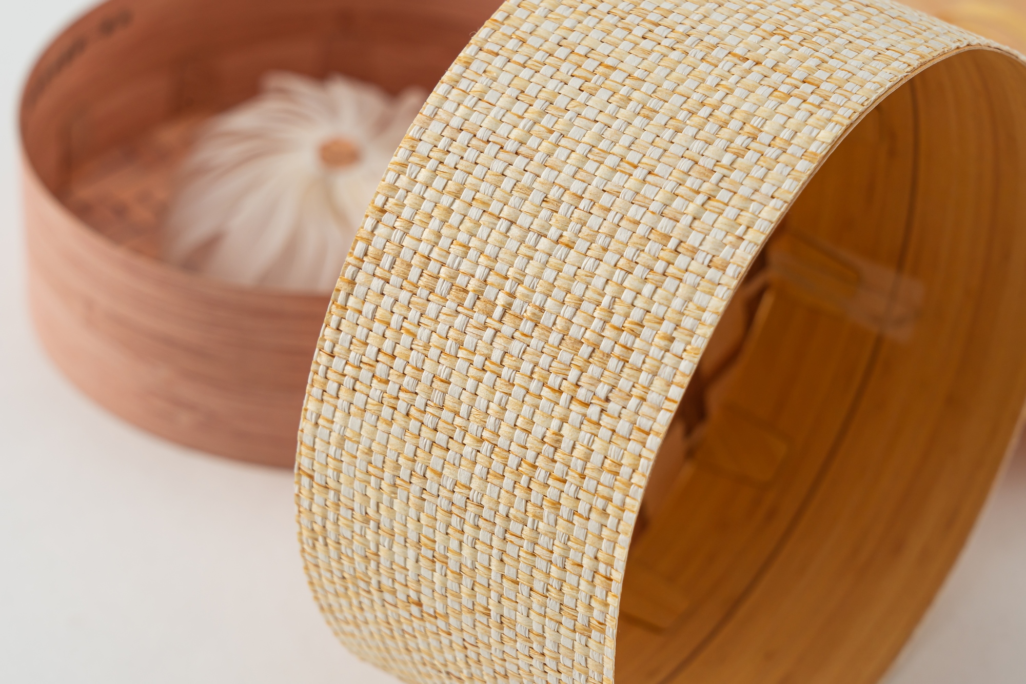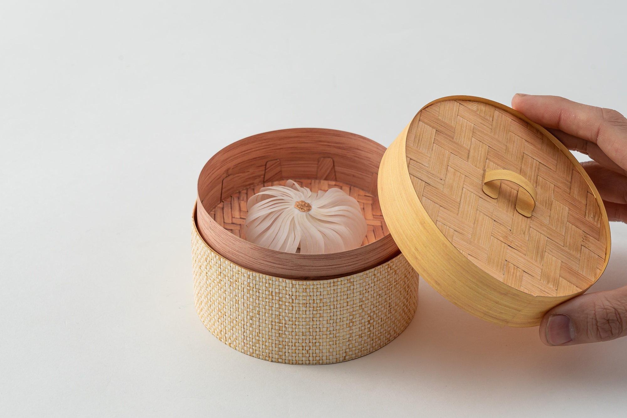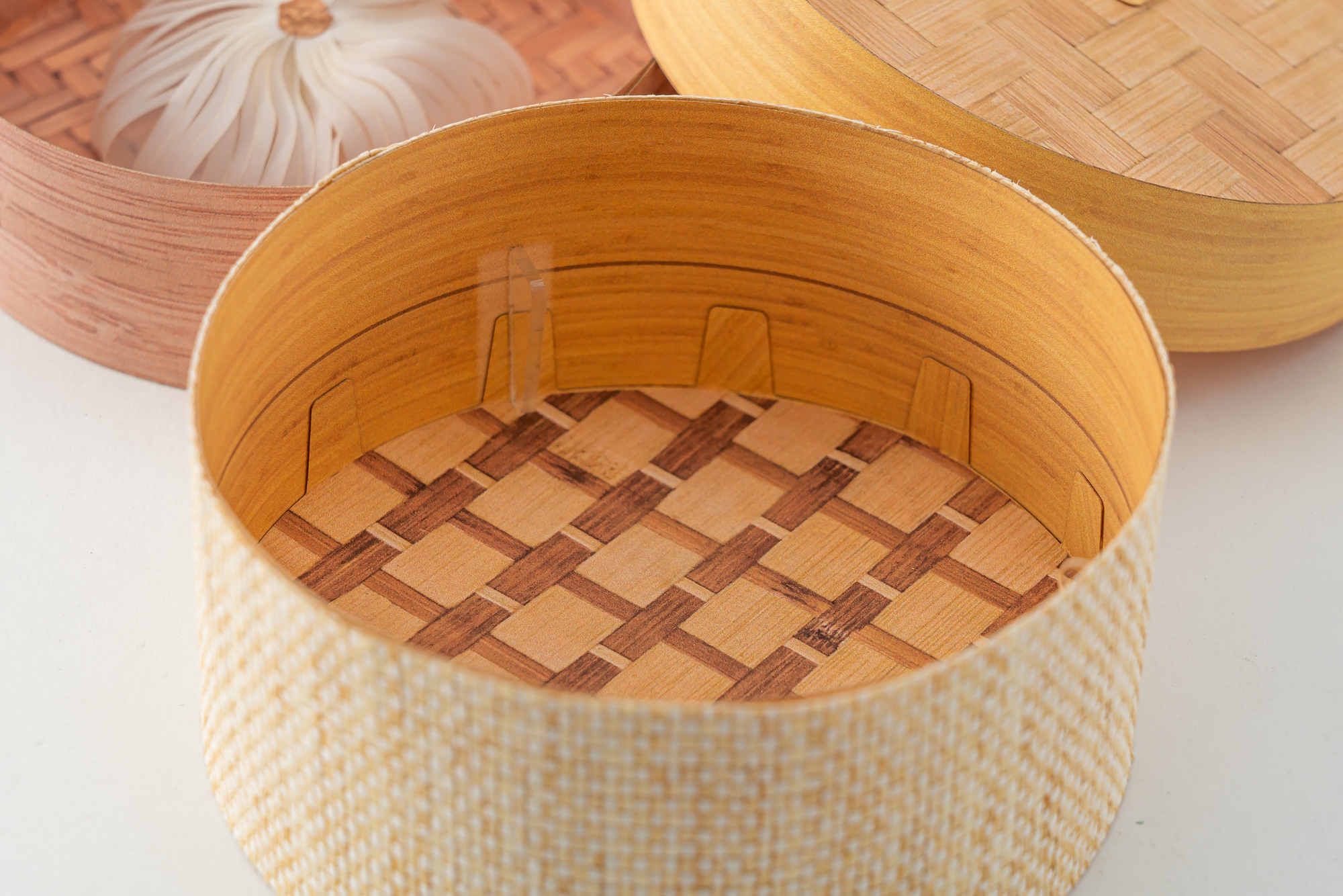 ❷ 紙製蒸籠造型收納盒,外蓋使用特殊材質的紙,呈現擬似編織的質地,內盒為雙層結構,掀開夾層有更多收納巧法~