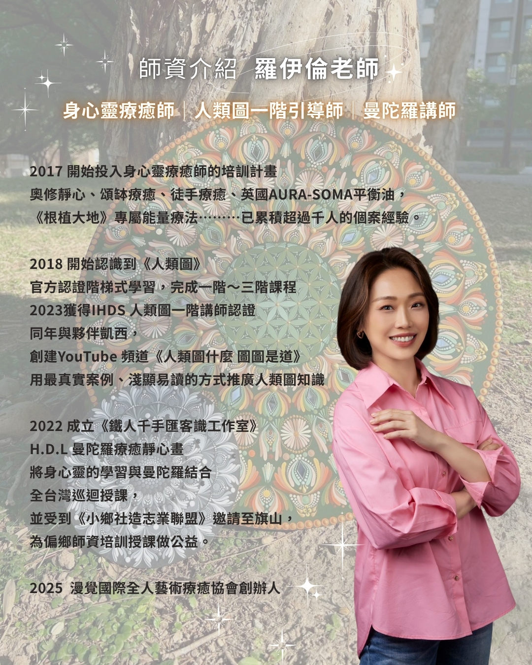 2022 成立 《鐵人千手匯客識工作室》H.D.L曼陀羅療癒靜心畫,將身心靈的學習與曼陀羅結合,全台灣巡迥授課,並受到 《小鄉社造志業聯盟》邀請至旗山,為偏鄉師資培訓授課做公益。