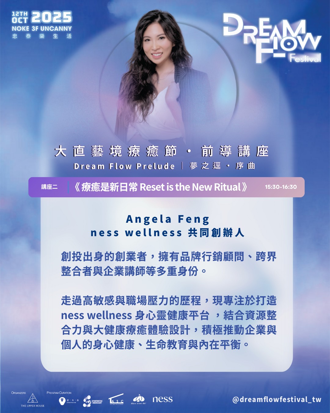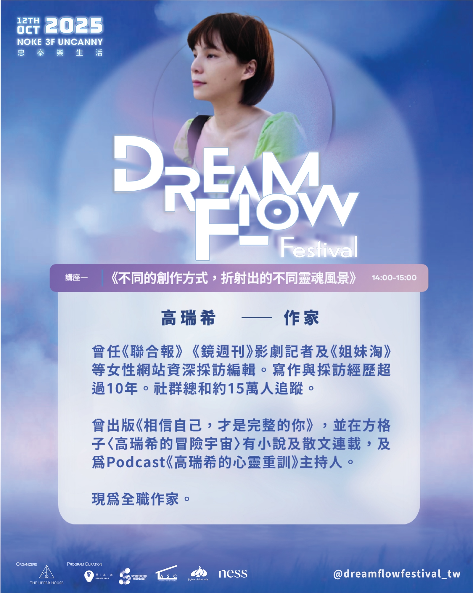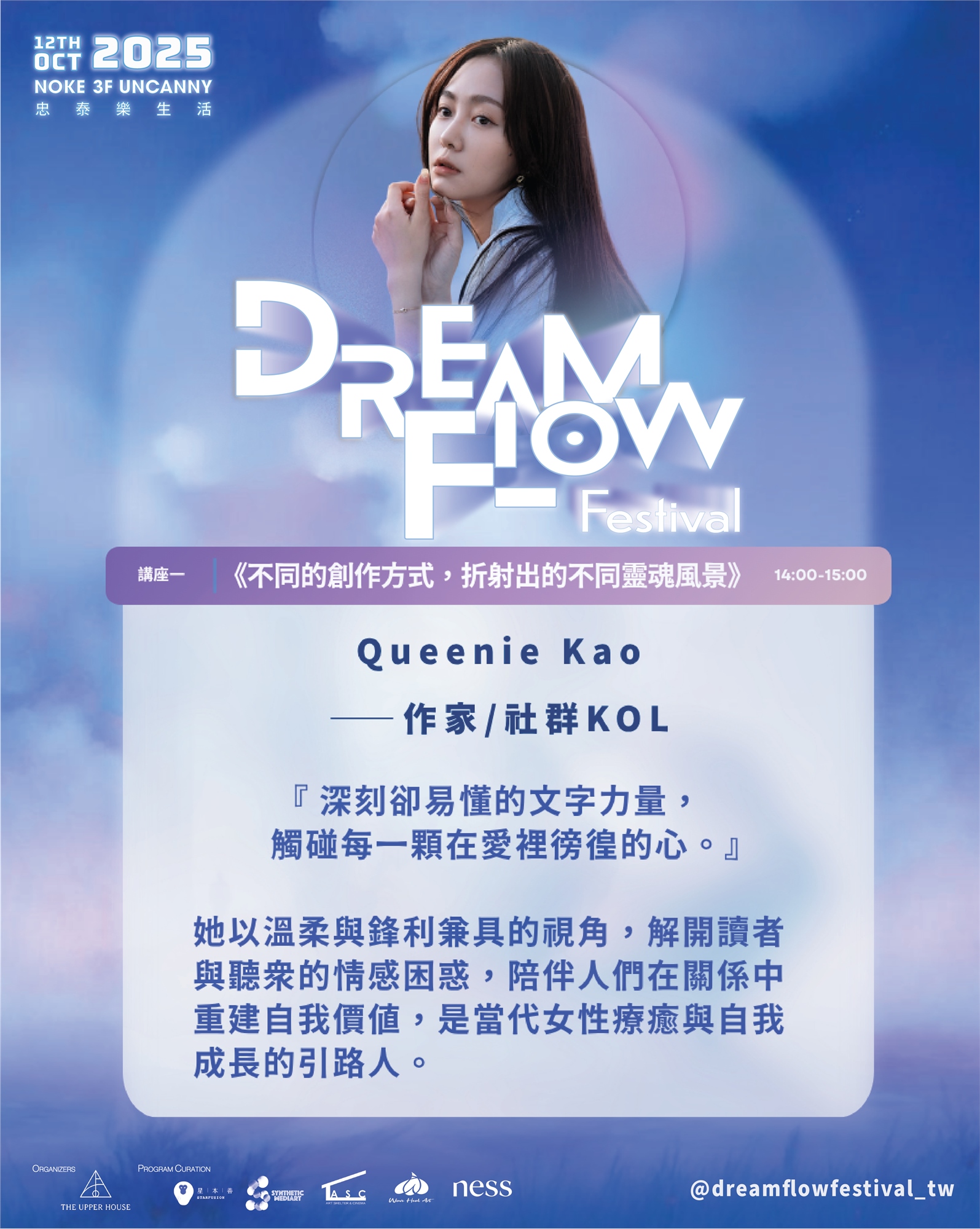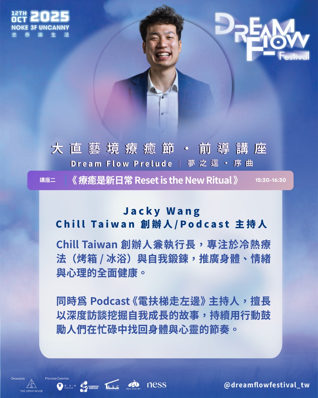 在正式迎來 Dream Flow Festival 大直藝境療癒節 前,這場前導講座將於 大直忠泰 NOKE 三樓 大階梯展開,作為一場關於「創作 × 療癒 × 生活覺察」的序曲。