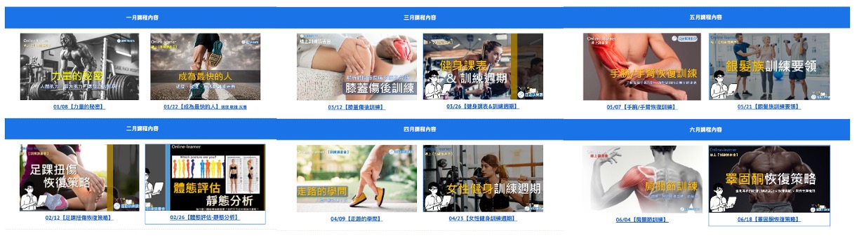 【力量的秘密】、【最快的人:速度與敏捷反應】、【足踝扭傷恢復策略】、【體態評估與靜態分析】、【膝蓋傷後訓練】、【健身訓練課表與週期】、【走路的學問】、【女性健身週期】、【手腕/手臂恢復訓練】、【銀髮族訓練要領】、【肩關節訓練】、【睪固酮恢復策略】等主題,共12集 , 一次滿足你對於過往內容的知識補強。