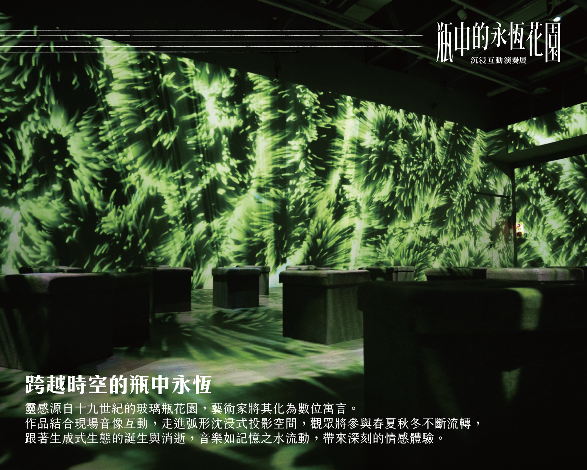 靈感源自十九世紀的玻璃瓶花園,藝術家將其化為數位寓言。作品結合現場音像互動,走進弧形沈浸式投影空間,觀眾將參與春夏秋冬不斷流轉, 跟著生成式生態的誕生與消逝,音樂如記憶之水流動,帶來深刻的情感體驗。