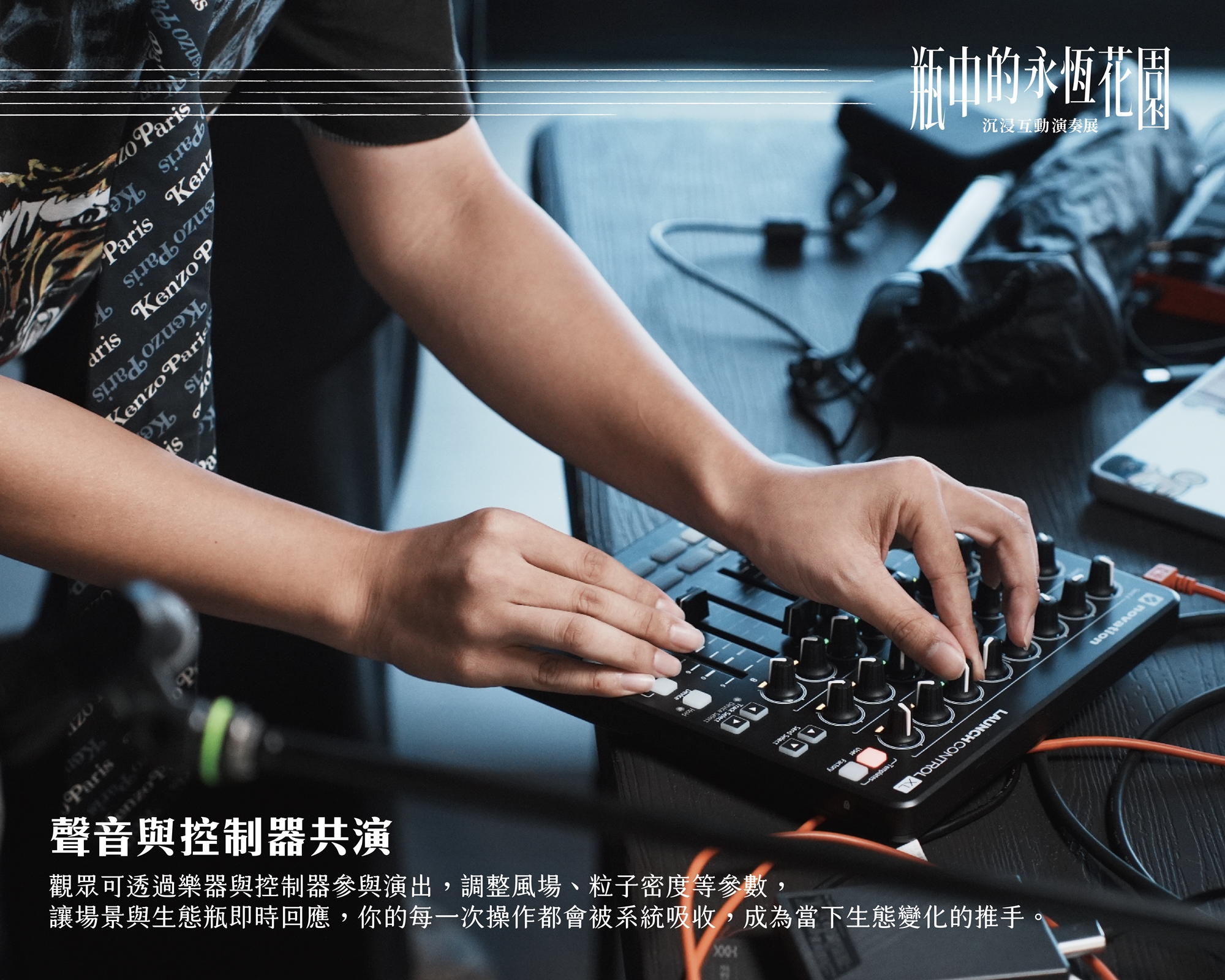 觀眾可透過樂器與控制器參與演出,調整風場、粒子密度等參數, 讓場景與生態瓶即時回應,你的每一次操作都會被系統吸收,成為當下生態變化的推手。