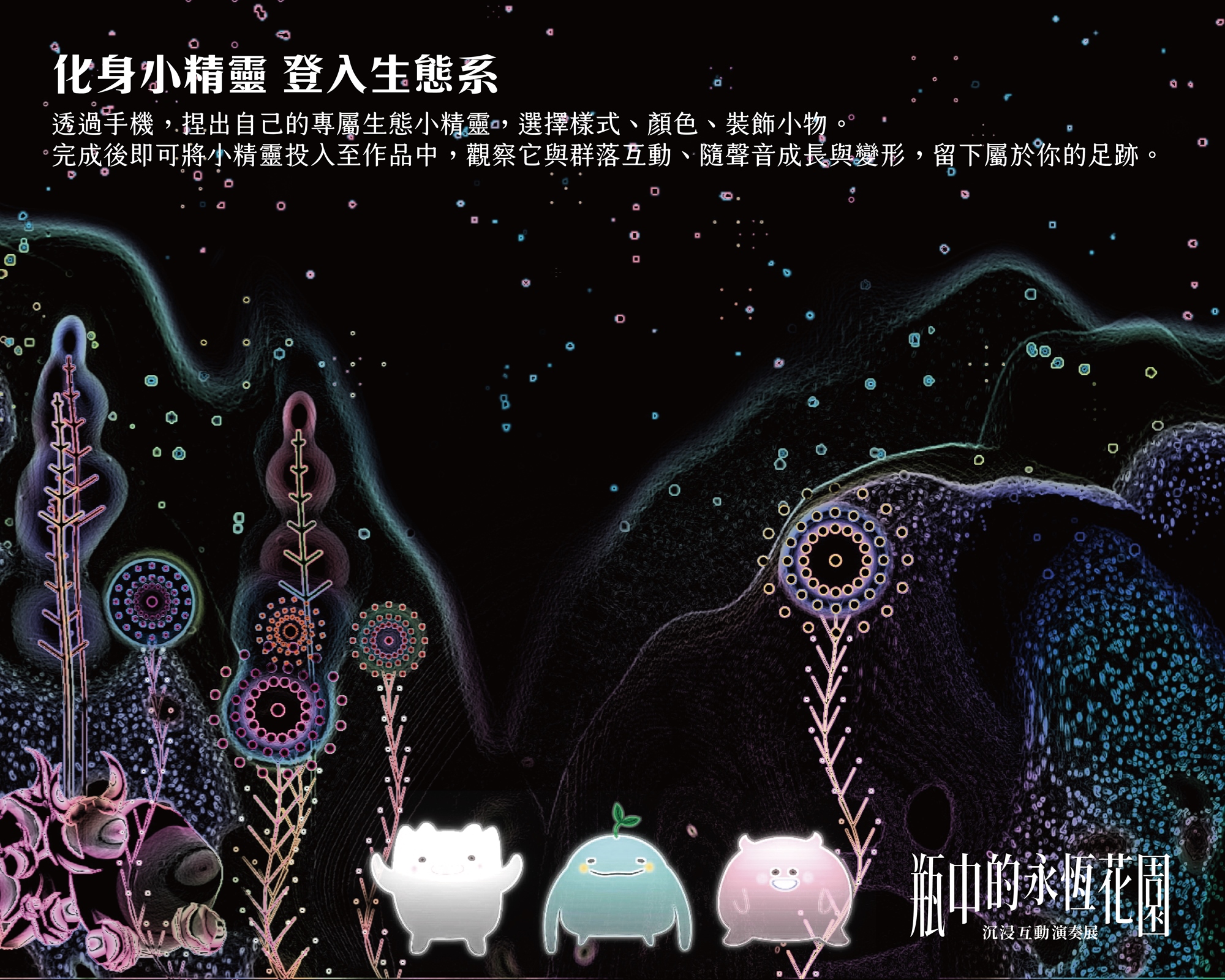 透過手機,捏出自己的專屬生態小精靈,選擇樣式、顏色、裝飾小物。 完成後即可將小精靈投入至作品中,觀察它與群落互動、隨聲音成長與變形,留下屬於你的足跡。