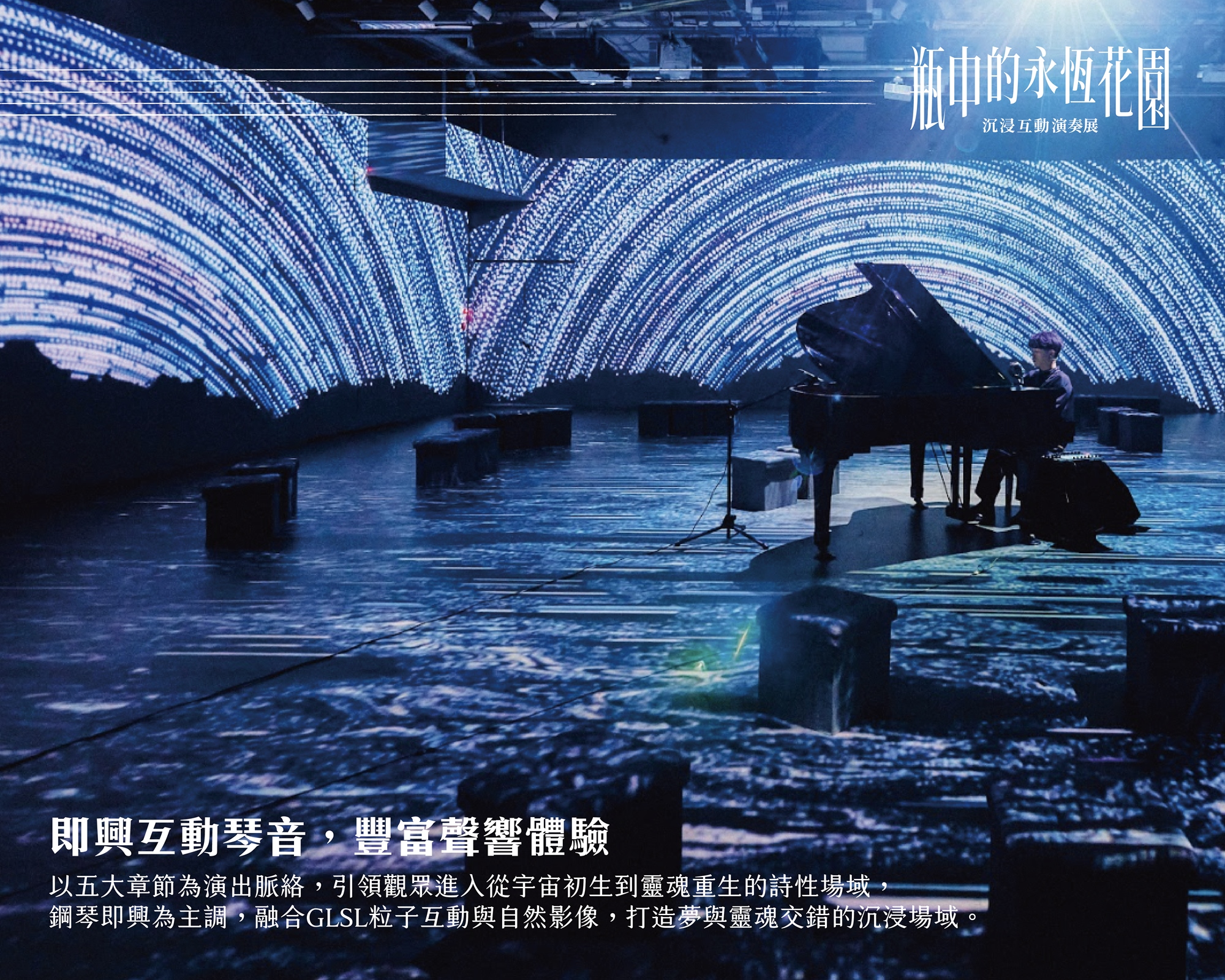 以五大章節為演出脈絡,引領觀眾進入從宇宙初生到靈魂重生的詩性場域, 鋼琴即興為主調,融合GLSL粒子互動與自然影像,打造夢與靈魂交錯的沉浸場域