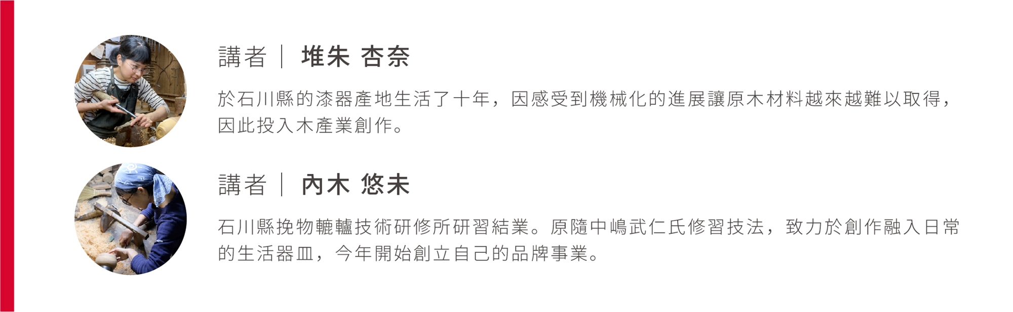 內木小姐將透過影片介紹木工車削(挽物)技法與自身作品特色,並分享創作心路歷程;堆朱小姐將以「什麼是傳統工藝?」為題,探討工藝的傳承意義與人與自然共生的智慧,兩位講者將共同帶領觀眾理解傳統工藝在現代的價值。