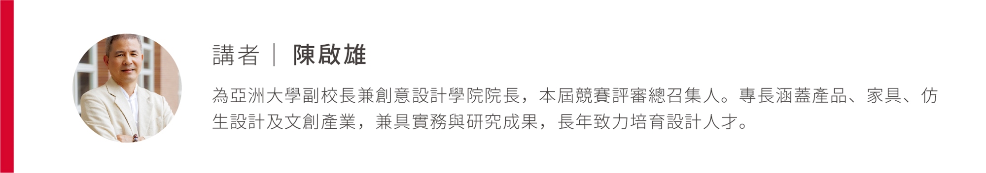 本場演講邀請大溪國際木家具工藝設計競賽評審總召陳啟雄老師,從臺灣設計教育與產業發展視角,檢視家具設計現況,並呼應系列展覽中的「家具史話」展區,引領觀眾理解家具設計思維、產業脈絡,以及打造具國際競爭力的家具新風貌。
