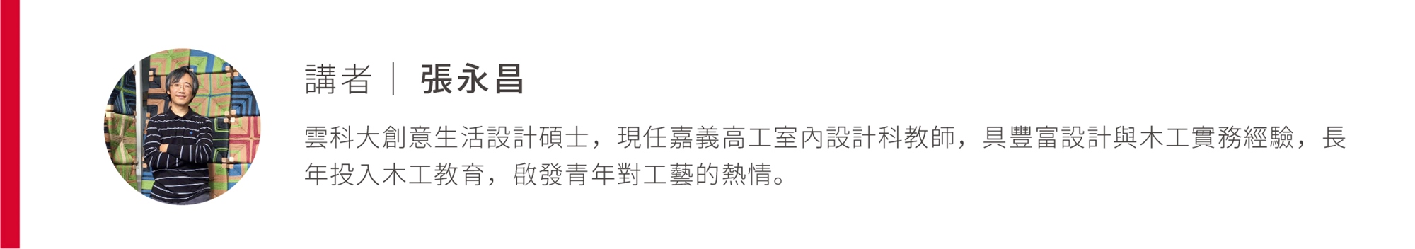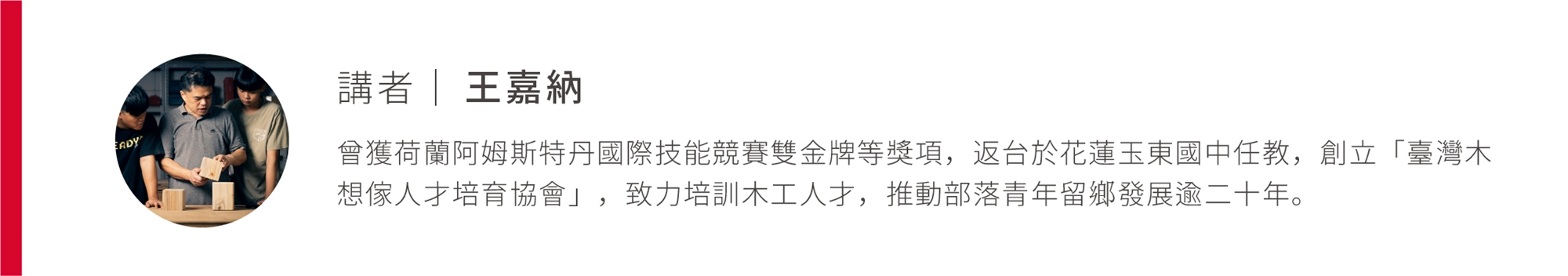 花蓮木想傢創辦人王嘉納先生,在花蓮玉里鎮為原鄉帶來創生夢想,每年製作超過200件精緻手作家具作品,多次受邀參與國際展覽,讓來自花蓮玉里的工藝技術站上世界舞台。今年更是帶領地方青年製作相思木扶手餐椅,獲2025年德國iF設計獎。將分享如何透過手工家具製作創造在地就業、培育青年職人,透過製作手工家具創造在地就業的故事激勵人心,足為大溪邁向工藝小鎮青年培育的成功案例參考。