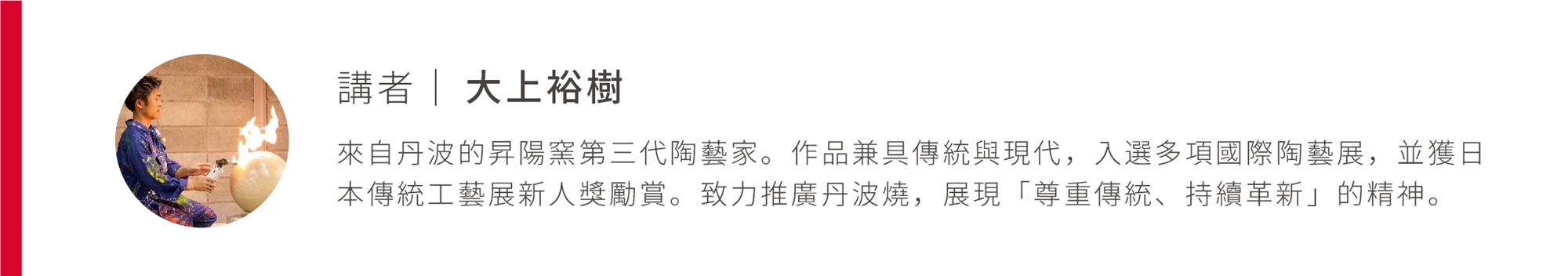 丹波立杭窯業產地的〈昇陽窯〉第三代陶藝家大上裕樹以個人創作者身份參展,分享他開設〈Living Gallery〉後,透過餐會「餐」、花藝企劃「土中之花」與駐村體驗「陶泊」,讓陶藝重新融入日常生活,並以百年後的丹波為願景,連結傳統、生活與產地文化的創新旅程。