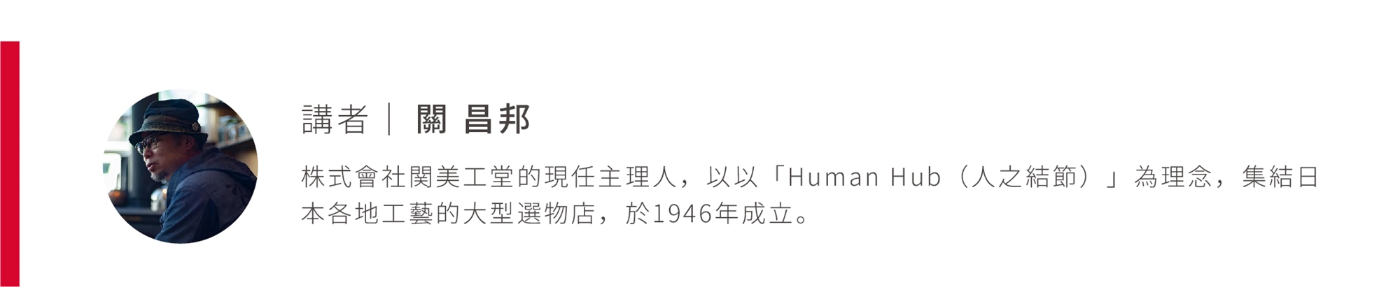 來自福島會津的関美工堂自1946年創立,以會津塗為核心,結合設計、空間與生活提案,展開新世代的地方創生實踐。第三代主理人關昌邦先生以「Human Hub(人之結節)」為理念,將分享如何從漆的歷史延展出共享工房、地方品牌與社群經濟的實驗基地——天寧寺倉庫,展現從工藝出發、重構生活與經濟土壤的地方實踐。