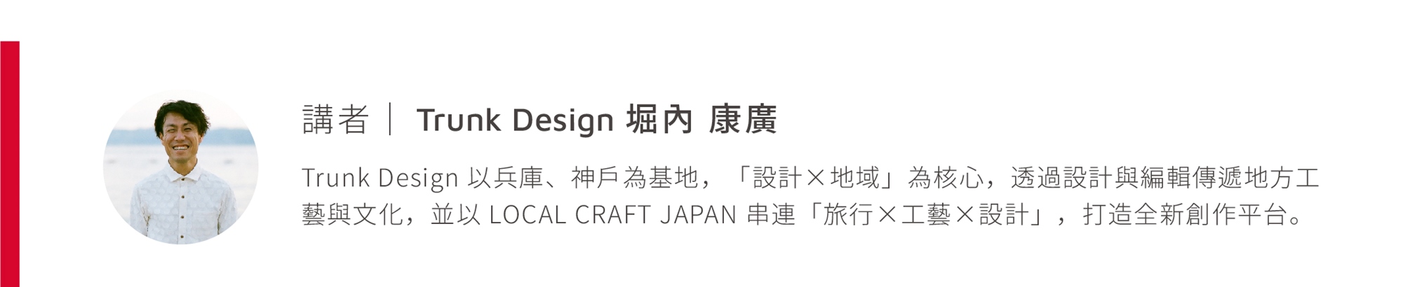 以兵庫・神戶為據點的 TRUNK DESIGN 長期以「設計×地域」為核心,透過 LOCAL CRAFT JAPAN 計畫連結旅行、工藝與設計。此次特別展〈設計解剖〉將呈現他們如何從視角、脈絡到製作過程「解剖」設計邏輯,讓觀眾體會設計誕生的軌跡與思維。