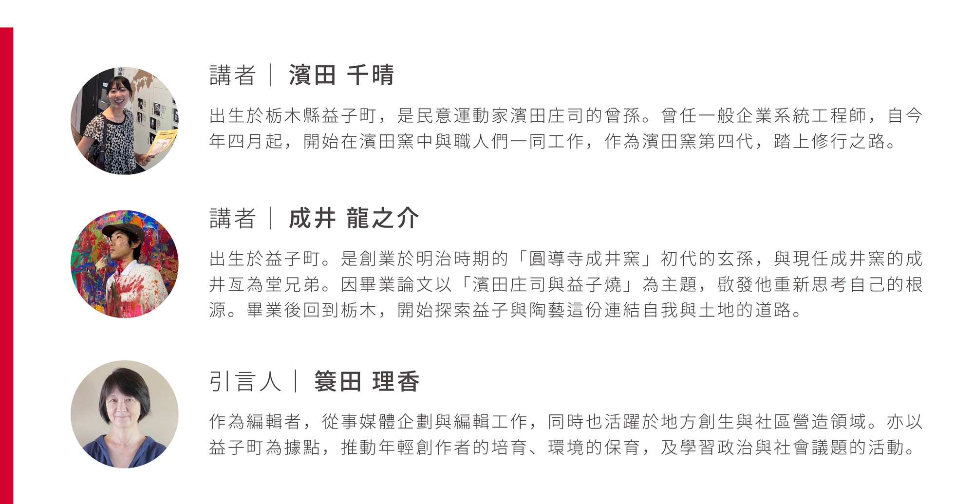在日本,農林水產業與傳統工藝領域都正面臨傳承與接班人短缺的課題。這次工藝週活動中,來自歷史悠久的窯廠:益子町濱田窯的濱田千晴,與成井窯的成井龍之介參與。簑田理香將擔任訪談主持人,與這些年輕一代一同探索工藝產地的永續可能性。