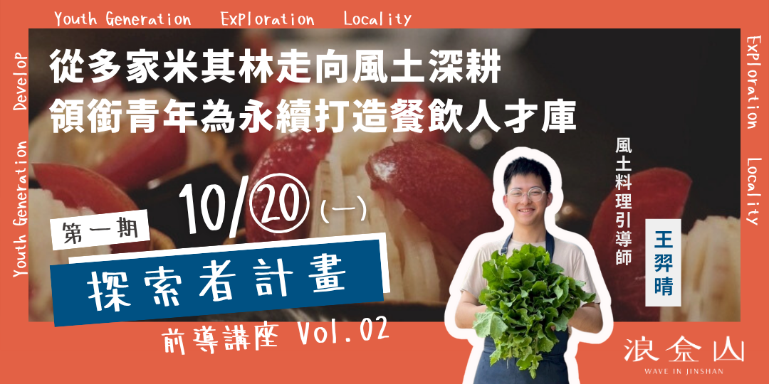 浪金山創辦人 蔡文培 和 料理研發擔當 王羿晴 將在 2 場前導講座中,分享那些簡章中沒提到的地方走跳故事,看看浪金山團隊夥伴是如何玩轉地方、建立青年基地,期待一起在這段探索旅程中解鎖更多可能,找到屬於自己的風土超能力。
