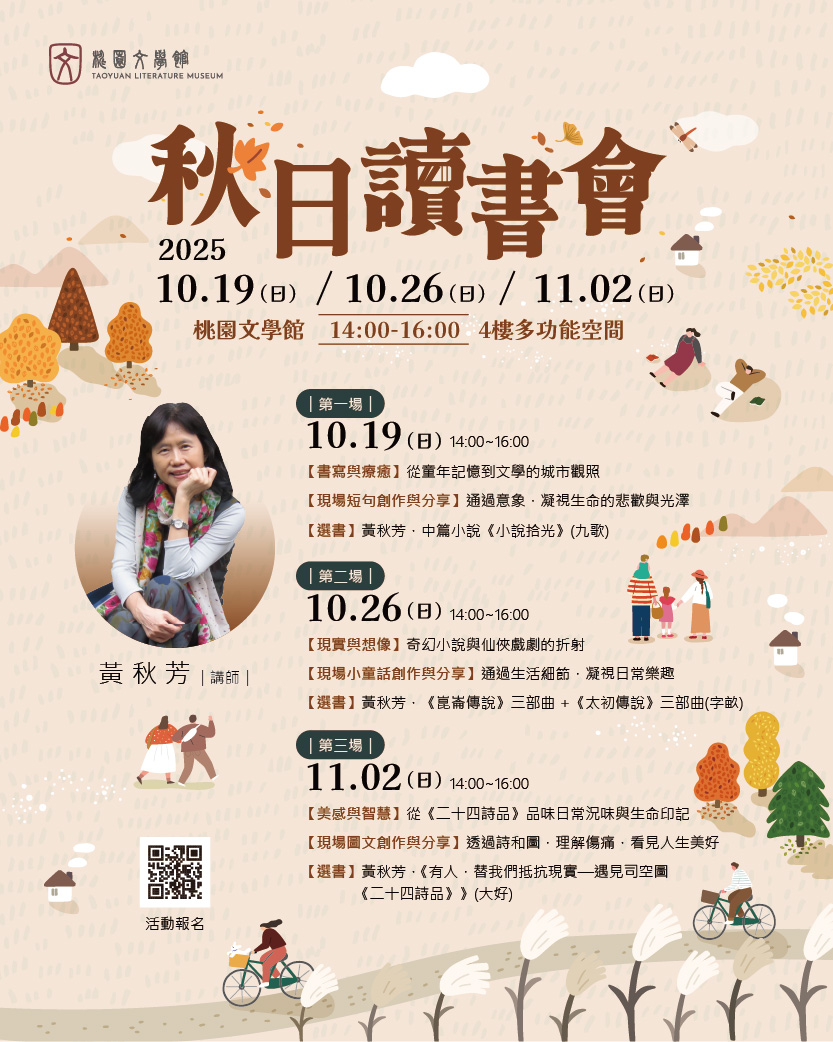 回歸生命書寫,引導讀者思考文學的療癒力量。透過閱讀與討論,探討如何從個人的成長記憶、童年足跡(無論是桃園在地或心靈層面)、不同城市與不同人事的遇合與碰撞,延伸至對桃園這座城市變遷的觀察與書寫,共同發掘文學如何觀照並記錄城市的「當下」與「未來」面貌。