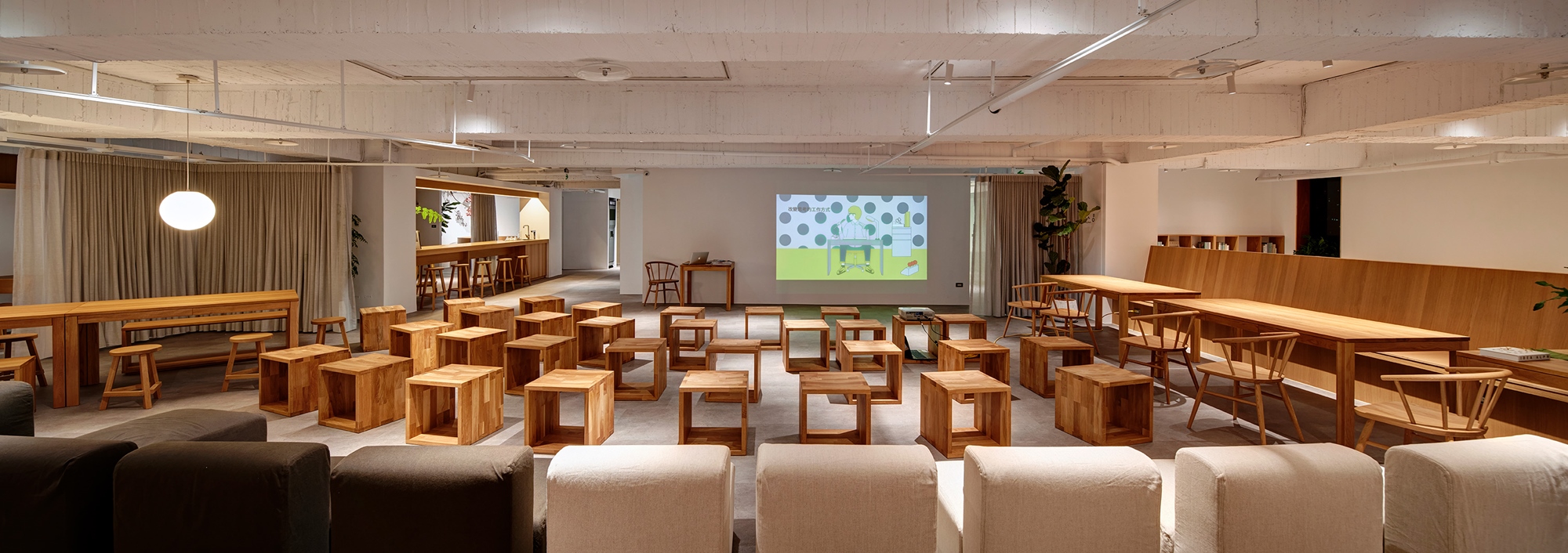 11F 開放共享層以「口袋」概念來做空間的圍塑,提供軟性隔間窗簾,全部拉上就是獨立空間,若是打開則可開放多人共享,創造出各種不同的工作樣貌,改變共用空間,將新竹地方文化注入