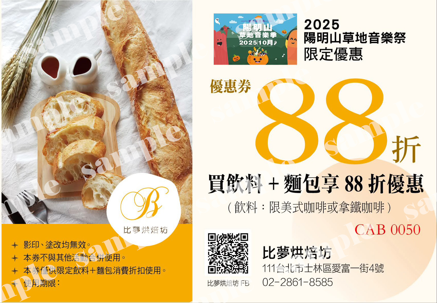 2、比夢烘焙坊麵包+飲料88折價券乙張