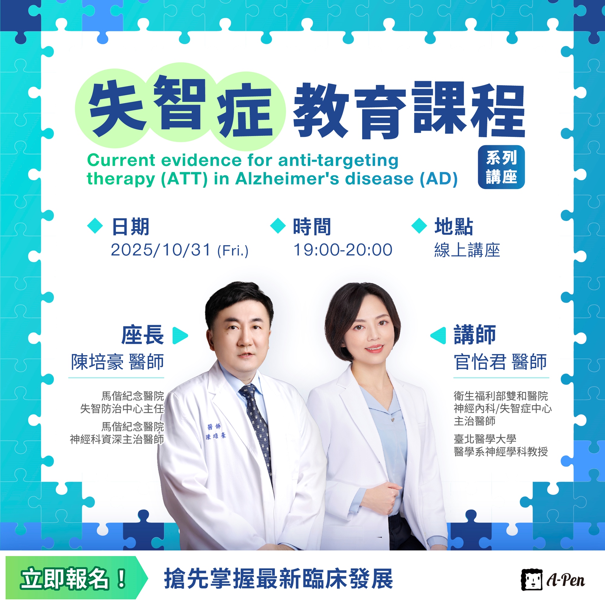📢 線上講座《Current evidence for anti-targeting therapy (ATT) in Alzheimer's disease (AD)》報名開催中❗