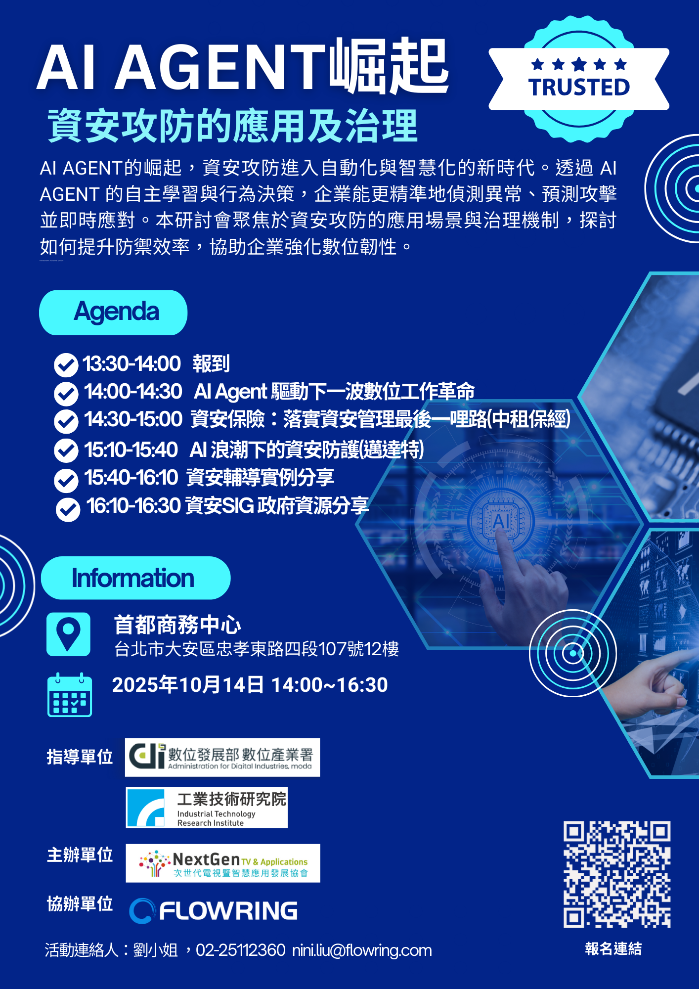 本場活動由數發部與工研院指導,邀請資安專家進行「實例攻防」演示,並由產業業者分享實際案例,帶領企業深入理解如何在 AI 驅動的新時代建立數位韌性,提升防禦力與營運持續性。本活動深入剖析 AI AGENT 帶來的新型態資安風險資安專家現場模擬攻防,揭露常見弱點與應對策略企業實務案例分享,提供具體防護與管理經驗聚焦「數位韌性」思維,協助企業建立長期競爭力。