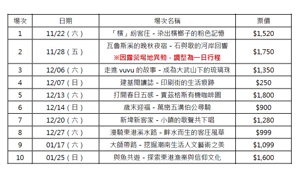 1. 若遇颱風來襲或氣候不佳,主辦方延期或取消事宜,將於出發前一天內以電話個別告知後續事宜。