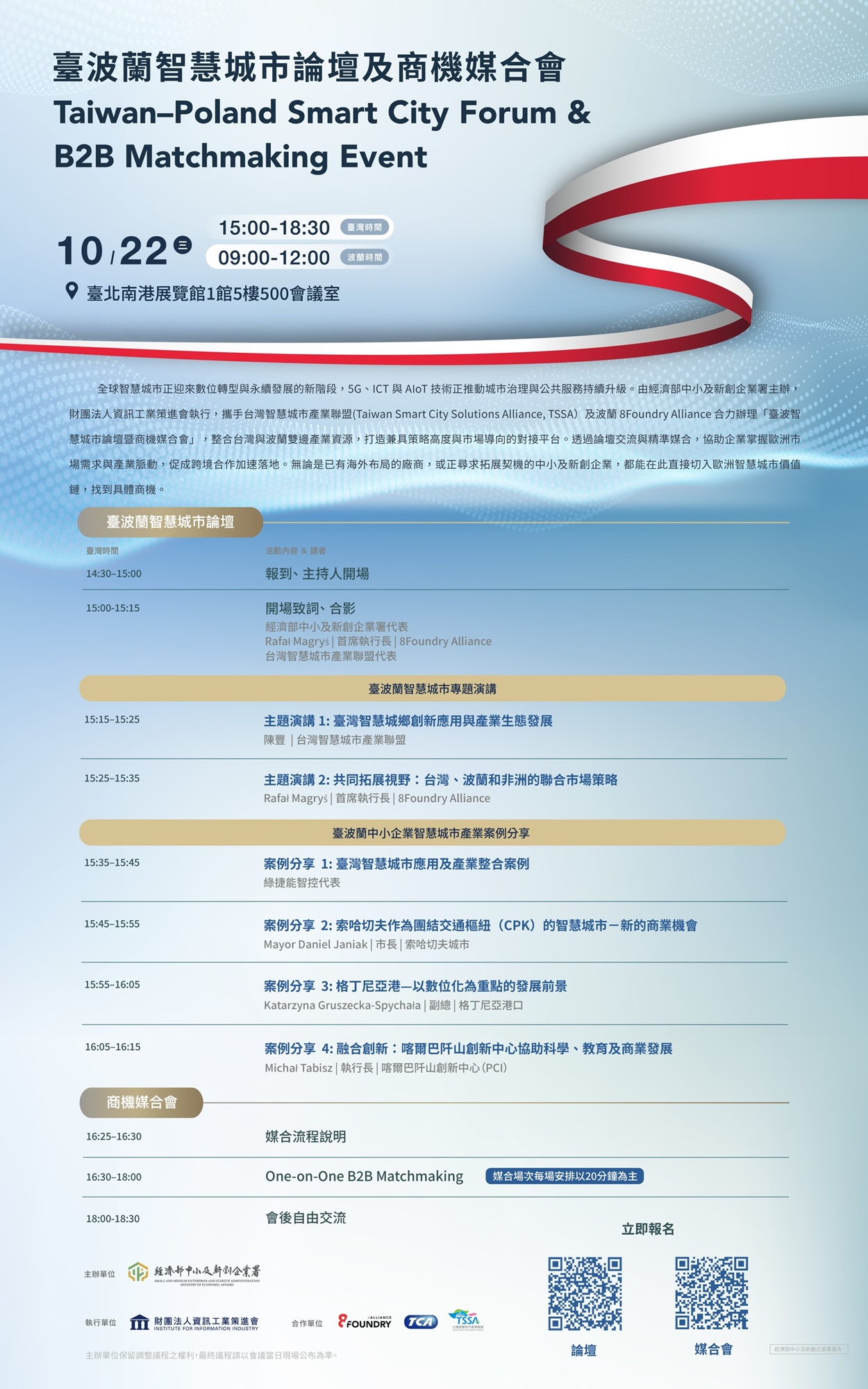 全球智慧城市正迎來數位轉型與永續發展的新階段,5G、ICT 與 AIoT 技術正推動城市治理與公共服務持續升級。由經濟部中小及新創企業署主辦,財團法人資訊工業策進會執行,攜手台灣智慧城市產業聯盟(Taiwan Smart City Solutions Alliance, TSSA)及波蘭 8Foundry Alliance 合力辦理「臺波智慧城市論壇及商機媒合會」,整合台灣與波蘭雙邊產業資源,打造兼具策略高度與市場導向的對接平台。透過論壇交流與精準媒合,協助企業掌握歐洲市場需求與產業脈動,促成跨境合作加速落地。無論是已有海外布局的廠商,或正尋求拓展契機的中小及新創企業,都能在此直接切入歐洲智慧城市價值鏈,找到具體商機。