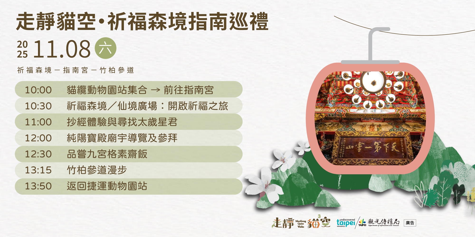 從貓纜眺望山城綠意,以「金龍神話」揭開祈福序幕;隨後以抄經靜心,臨摹呂祖百字碑並尋訪太歲星君,感受靜謐力量。中午於純陽寶殿參拜導覽後,於齋堂品嚐九宮格素齋,體驗山林間的清心飲食。午後沿竹柏參道徐行而下,讓自然與信仰的祝福隨步流轉,回歸生活日常。
