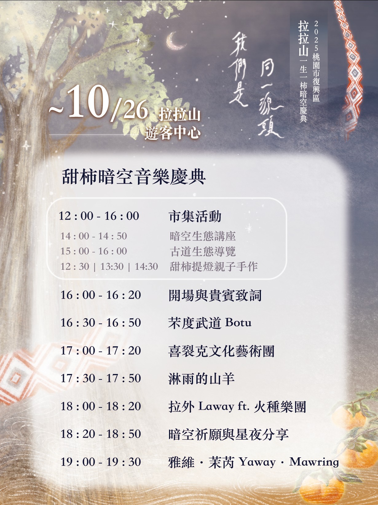 🔸10/26 (日) 中午 12:00-19:30 將於拉拉⼭遊客中⼼前廣場,舉辦《我們是同一源頭》暗空甜柿音樂慶典,現場將有在地特色農產市集、暗空生態講座、親子手作體驗活動等,並邀請泰雅金曲歌手、口簧琴音樂家、復興區歌手等,以及精彩的抽獎活動讓大家將拉拉山的美好帶回家,歡迎前來免費參與!