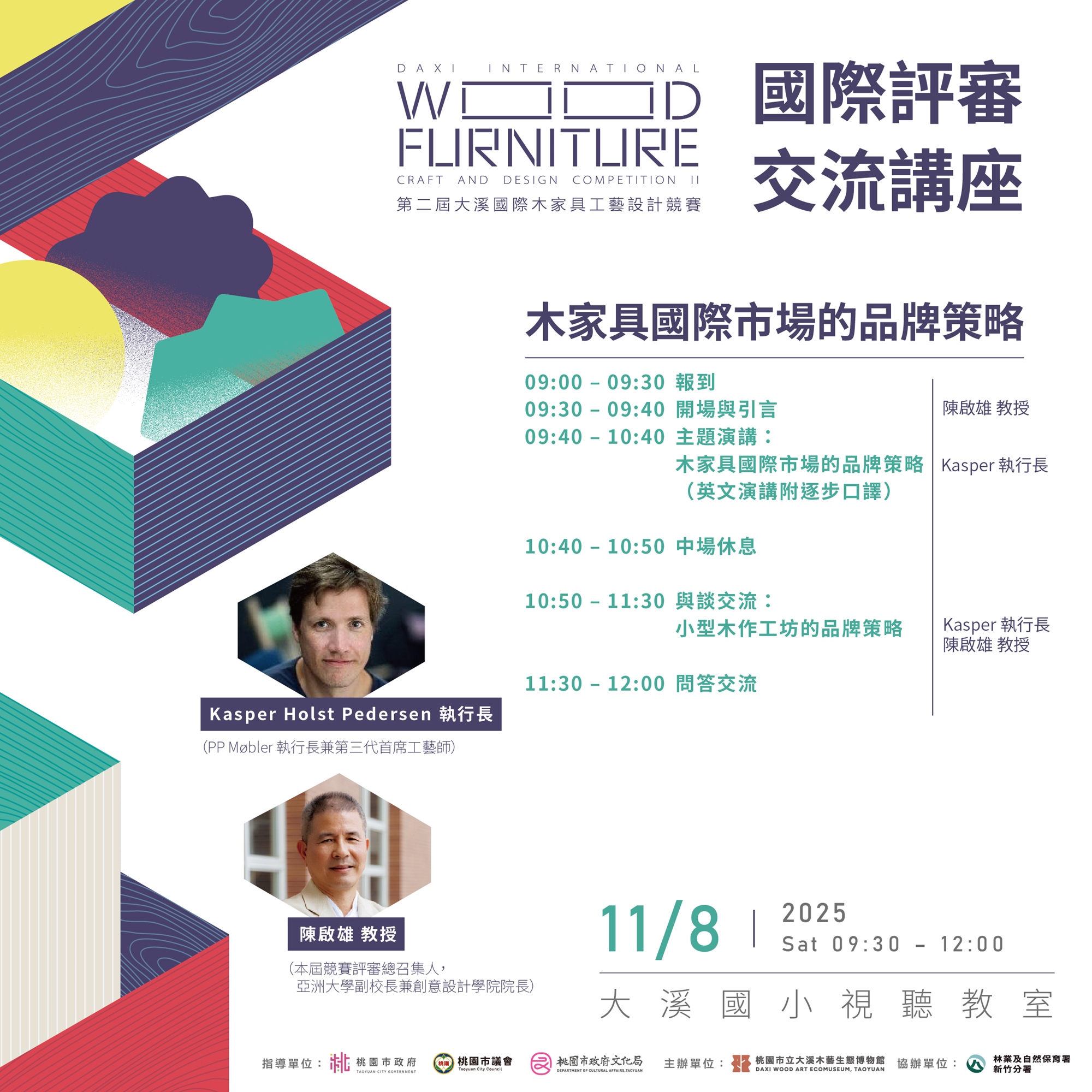 本次講座以「木家具國際市場的品牌策略」為題,Kasper將分享他如何在全球市場變動中持續維護品牌價值,以及幾年來品牌的承繼與創新。他也將回應工藝之城大溪的關懷:小型工作室與地方工坊該如何經營自有品牌、建立特色,並形成共同行動的力量?相信透過與本屆評審團主席陳啟雄教授的對談,將為臺灣的木工藝匠人與從業者們帶來深刻啟發。