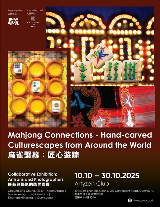香港—— 2025年10月1日—— 由Karen Aruba Art呈獻,最新展覽「麻雀繫緣:匠心遊踪」即將於10月10日至30 日於尊貴私人會所雅辰會Artyzen Club舉行。是次展覽將透過攝影鏡頭帶領觀眾走進不同文化脈絡,展現手雕麻雀工藝的蛻變,並探索「麻雀遊戲」如何影響人際關係的細微互動,於疫情後再度成為全球文化熱話與連結橋樑。展覽場景呈現工匠精湛的手藝、當代設計的優美圖像,以及融合光影攝影的視覺魅力,突顯傳統與現代交融的藝術魅力。