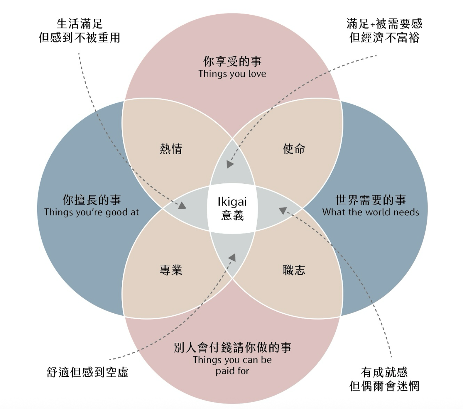 當這四個圈交會於一點時,那就是你的 Ikigai——你的存在意義與生命使命。
