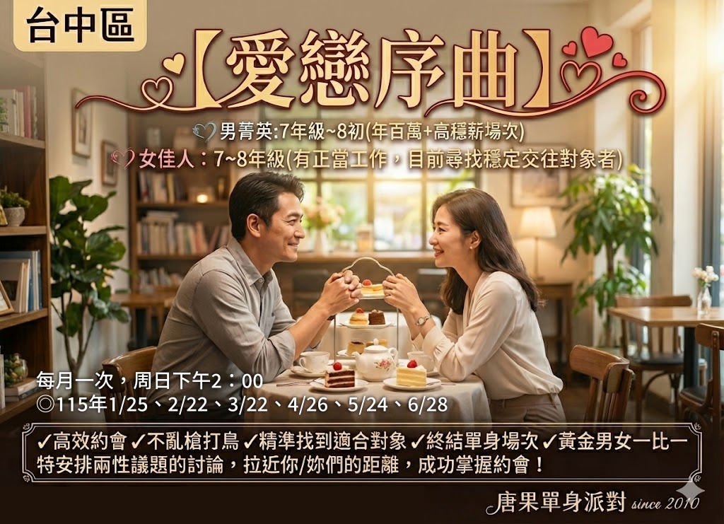 (台中聯誼)01/25(日)14:00【愛戀序曲 : 七年級男菁英篇】台中交友|台中相親|交友APP|單身聯誼|中科聯誼|男女1:1|菁英聯誼|未婚二春伴侶|相親|月老|媒人
