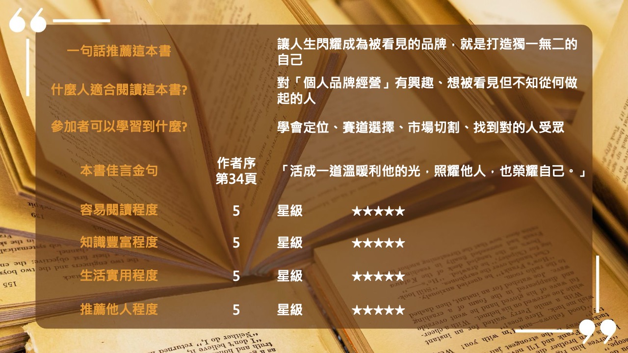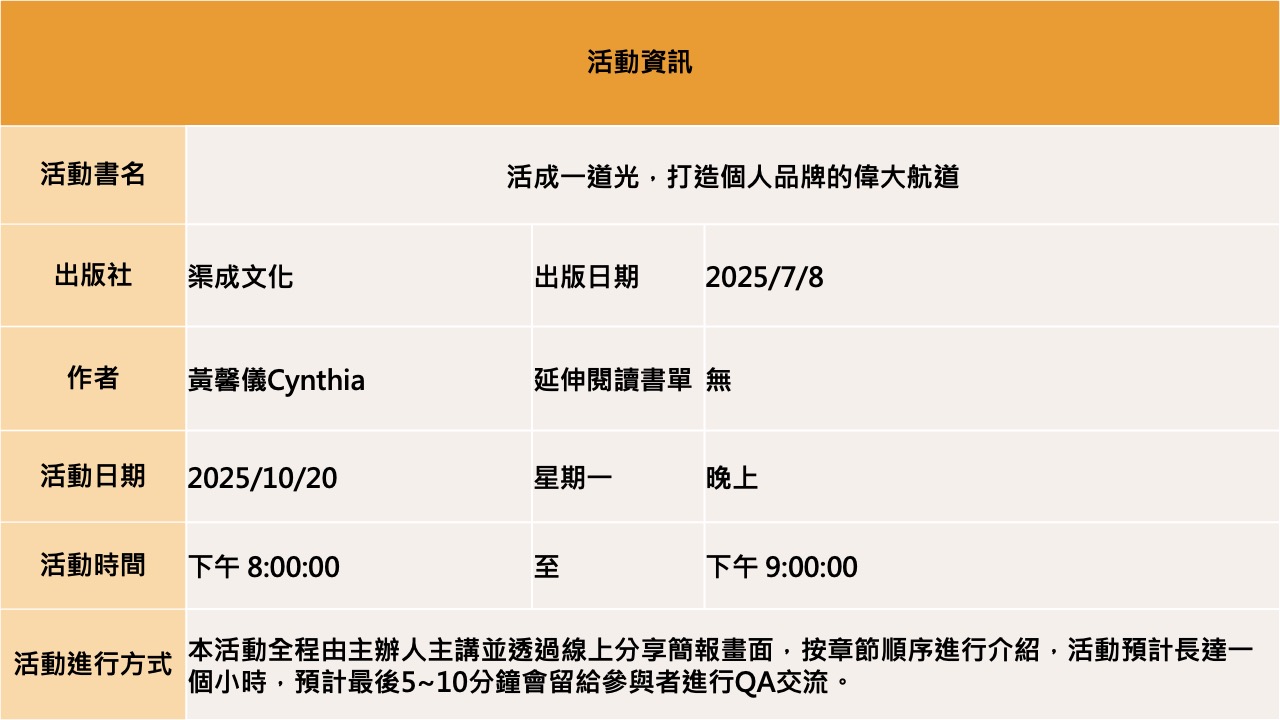 【BookBook預約線上讀書會】活成一道光:打造個人品牌的偉大航道