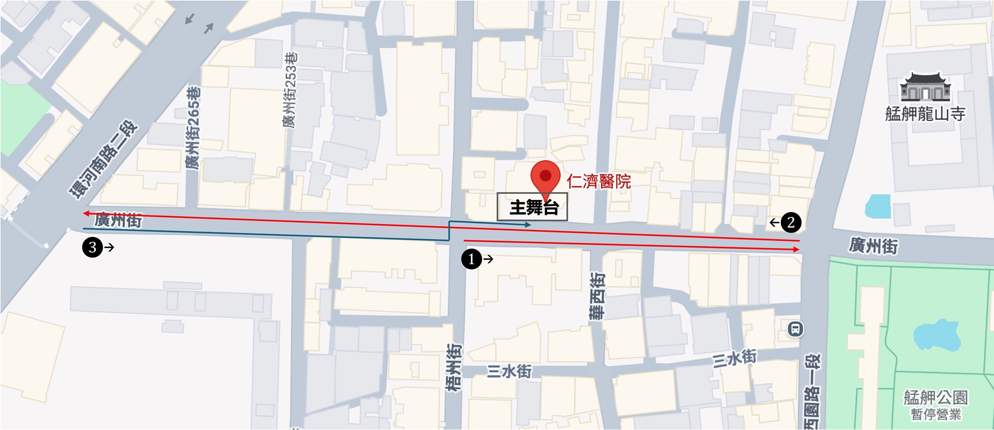遊行路線:廣州街自西園路至環河南路段(如下圖),遊行路線依序為❶→❷→❸,最後回到主舞台,結束遊行活動。