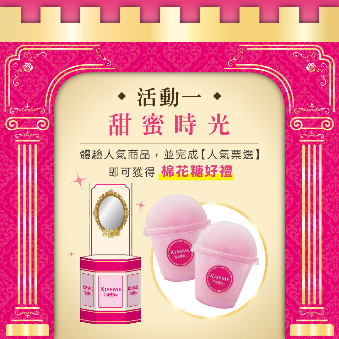 走進專屬的魔法試妝間,體驗品牌最新限定眼彩與人氣商品,完成【人氣票選】即可獲得「棉花糖好禮」,為你的妝容增添一抹甜蜜驚喜!