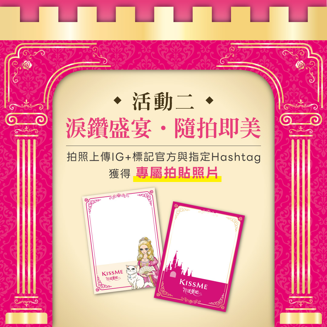 現場拍照上傳 IG 並標記官方帳號 @kissme.heroinemake 與 #KISSME 花漾美姬20週年,即可免費印出夢幻專屬拍貼照片,珍藏屬於你的閃耀記憶。
