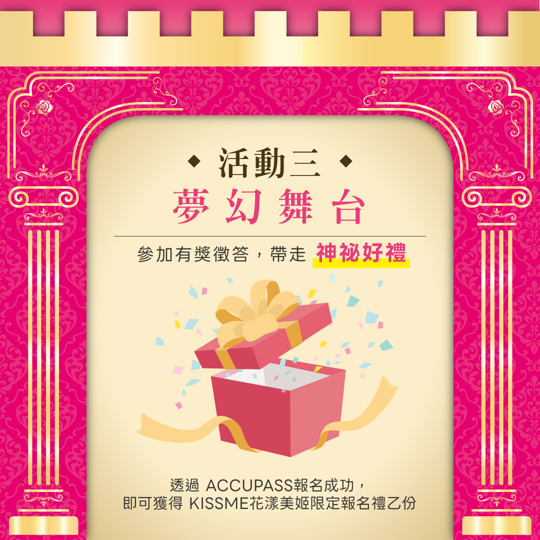 【ACCUPASS限定好禮】透過 ACCUPASS報名成功,即可獲得 KISSME花漾美姬限定報名禮乙份。