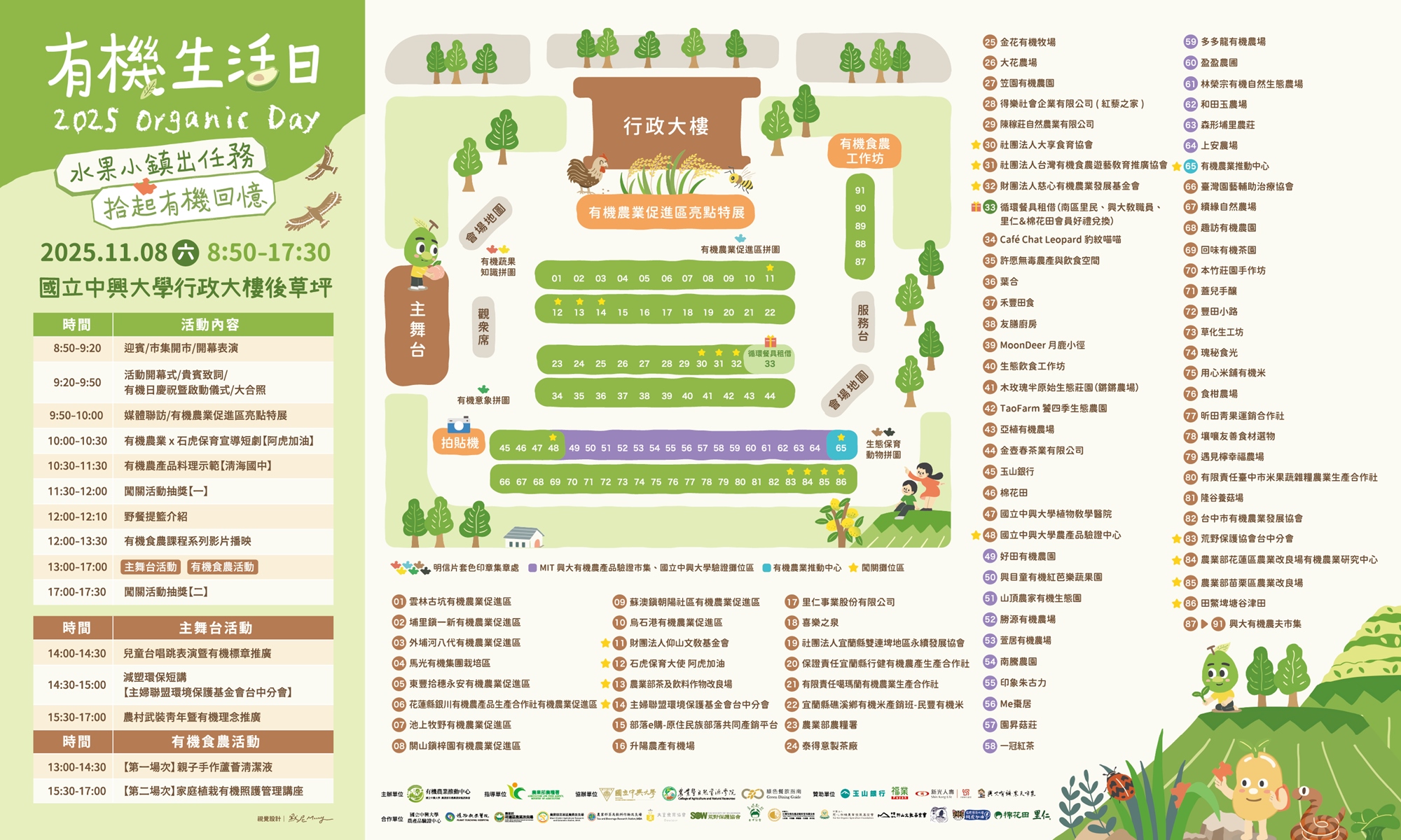 以三大主題「有機」、「食農」、「生態」作為活動設計主軸,活動當天只要順利完成六個攤位集章並至本中心攤位完成指定任務,即可兌換限量好禮!