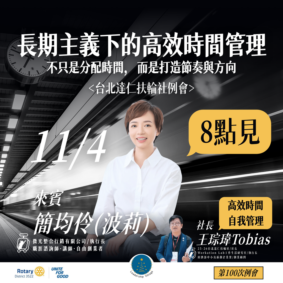 本次活動跟"台北達仁扶輪社"共同主辦,講者活動分享時間為20:10-21:10。21:10-21:30為Q&A和台北達仁扶輪社分享時間,也歡迎大家一同參與及發表意見喔!