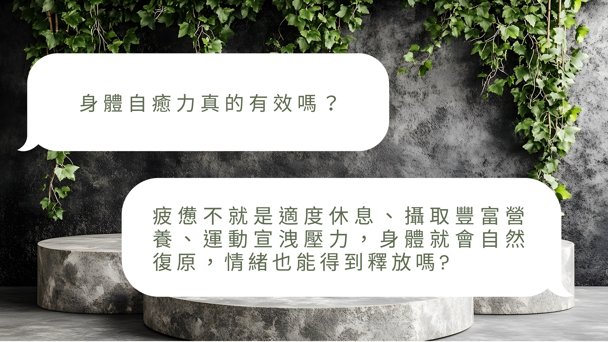 👩🏻 : 「疲憊不就是適度休息、攝取豐富營養、運動宣洩壓力,身體就會自然復原,情緒也能得到釋放嗎?」