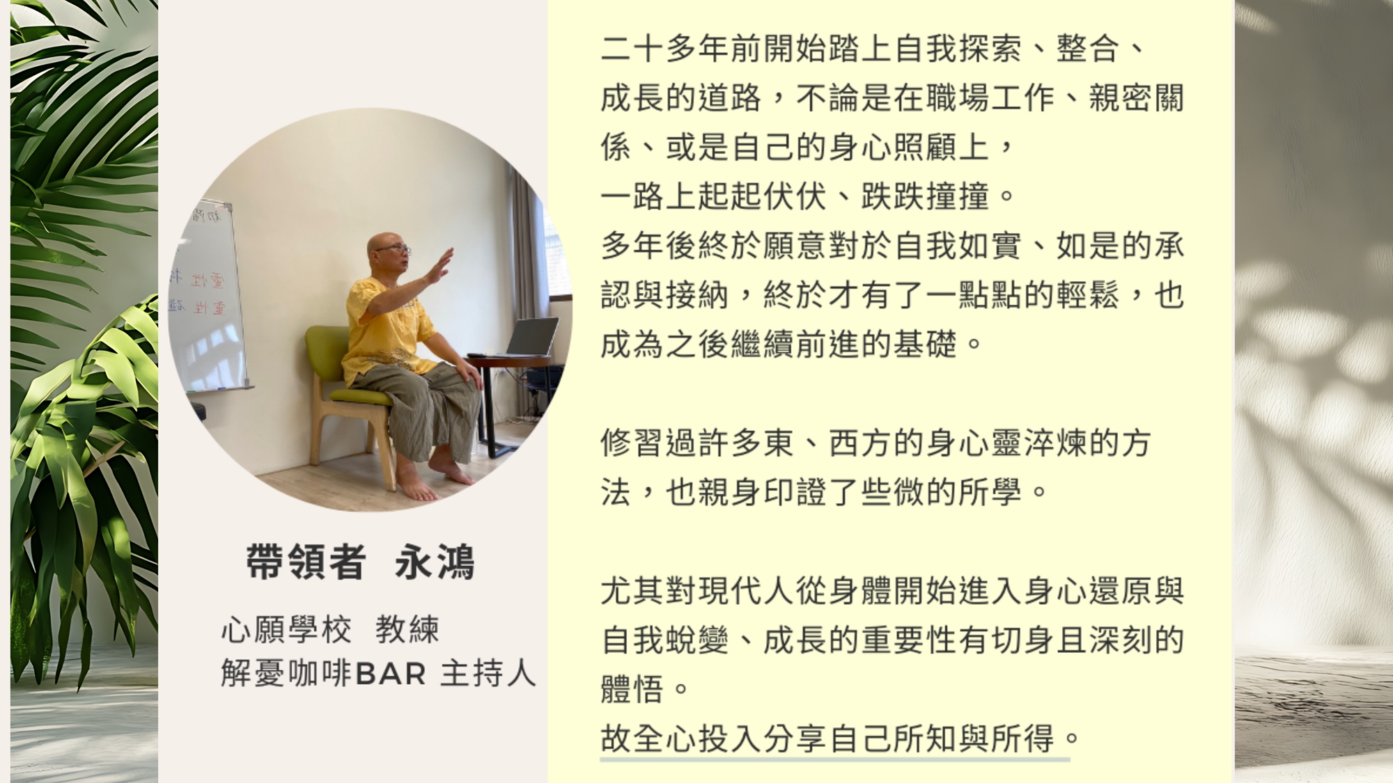 學習在不費力的自然狀態下將重量交給地板,讓身體回到歸零狀態。這種由內而外的平衡,讓你在面對工作、生活中的每一步都更輕鬆、更持久。